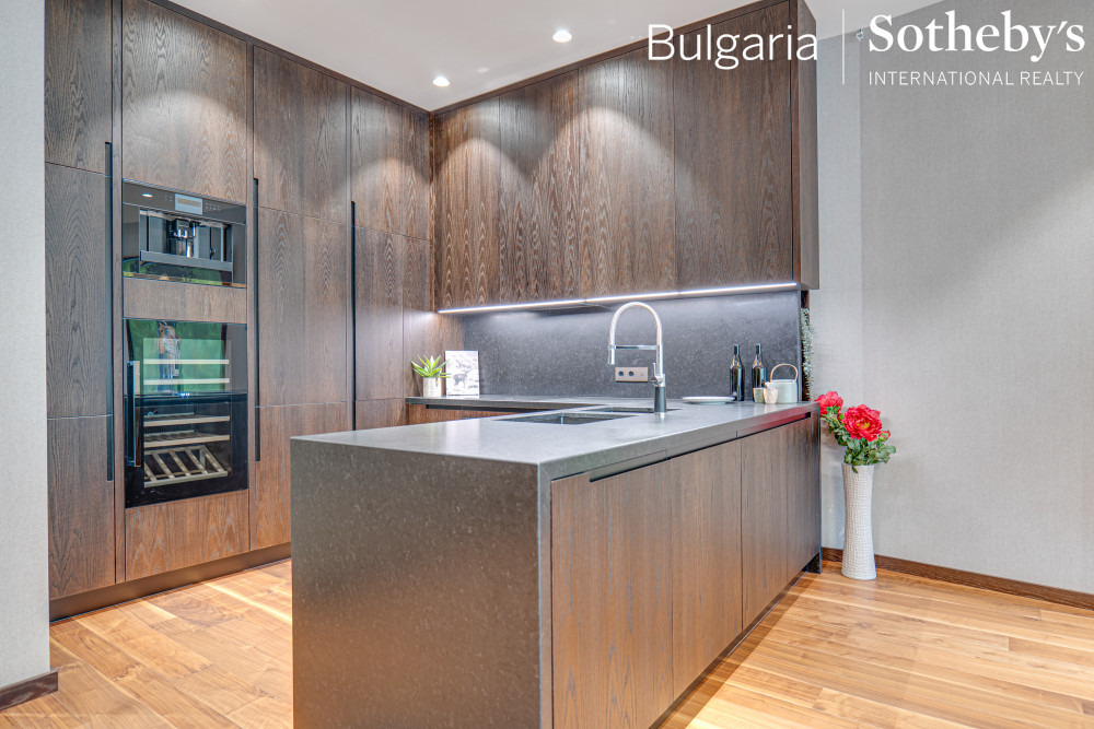 Апартаментът е луксозно завършен и напълно обзаведен с материали и оборудване от най-висок клас. В дневната е инсталирана модерна кухня с висококачествени вградени уреди Miele.