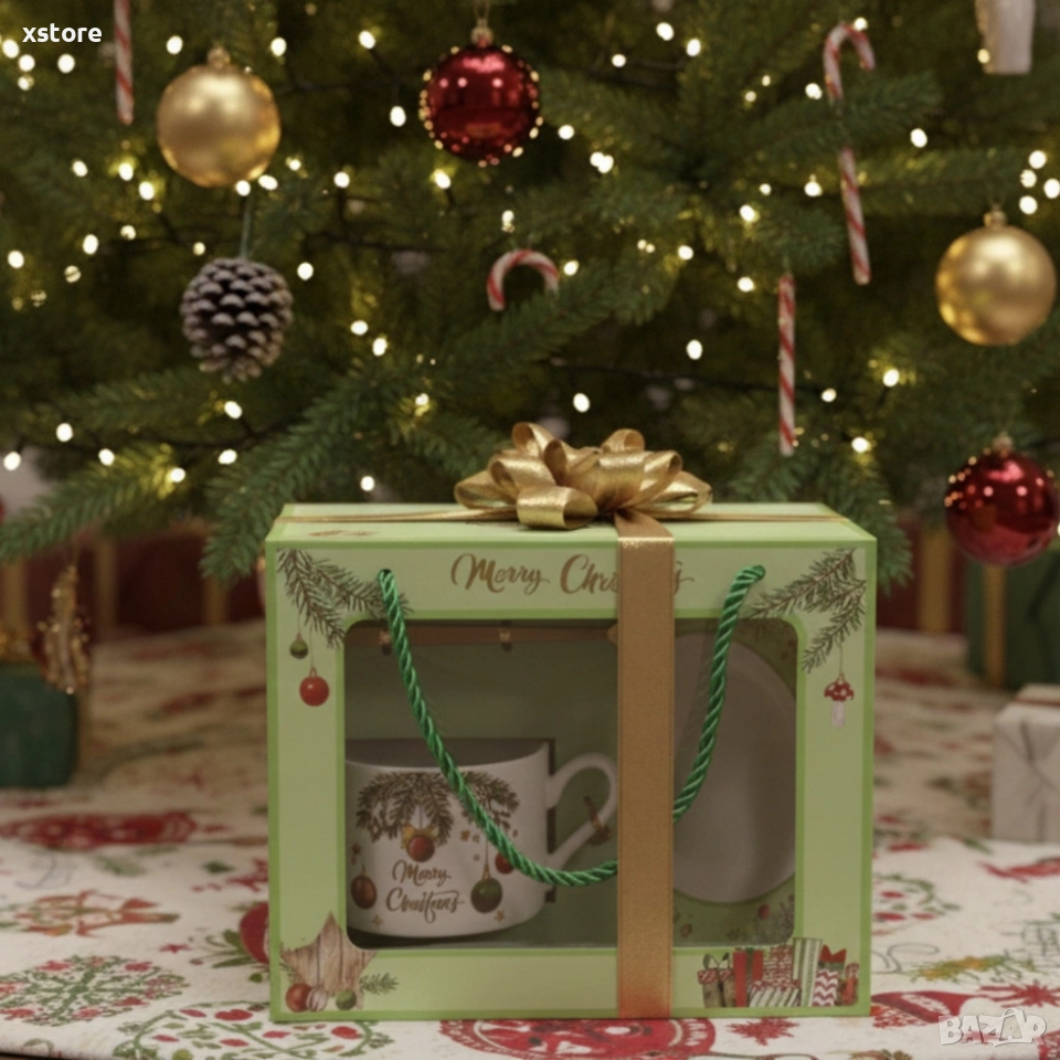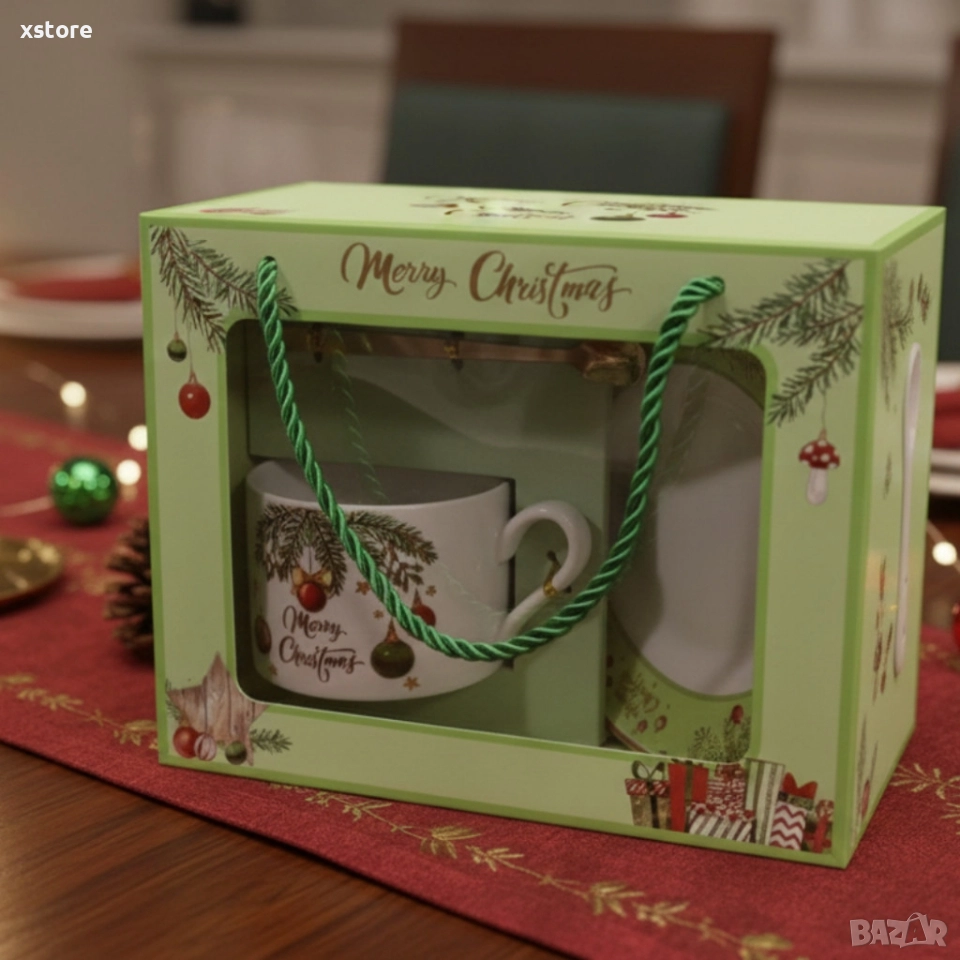 Технически характеристики Материали: Керамична чаша; лъжичка и лъжичка – метал; Размери: Чаша ~330 мл; компактна чинийка, удобна за сервиране; Цветове: Празнични зелени и червени мотиви; Безопасност: Подходящо за топли напитки; здрава керамика; Допълнителни елементи: Подаръчна кутия, въже за носене, прозрачна витрина; Подходящ за деца: Да – без остри елементи, стабилен дизайн; Подаръчна кутия: Дебел картон, декоративни акценти, готова за поднасяне.