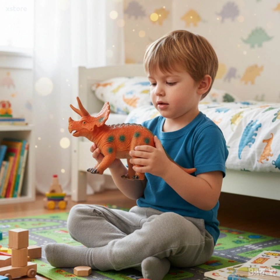 Ако детето ти обича динозаврите, този комплект “Dinosaur Era” ще го зарадва! Всеки динозавър реве при натиск – реалистичен звук, който оживява играта. Комплектът включва различни видове (T-Rex, Трицератопс, Брахиозавър и др.) с дължина 27–33 см, изработени от безопасна PVC пластмаса. Развива въображението, познанията и сетивата на детето. Подходящ за възраст 3+. Чудесен подарък за малки изследователи!