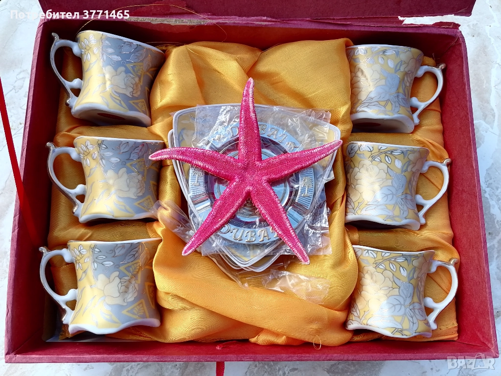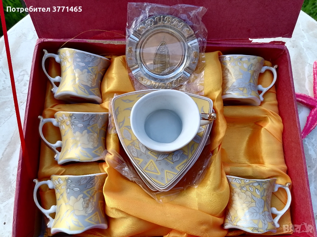 Кафе комплект Дубай чашка с чинийка 6бр, пепелник 1бр 15лв. Кутията е леко скъсана, видимо на снимката