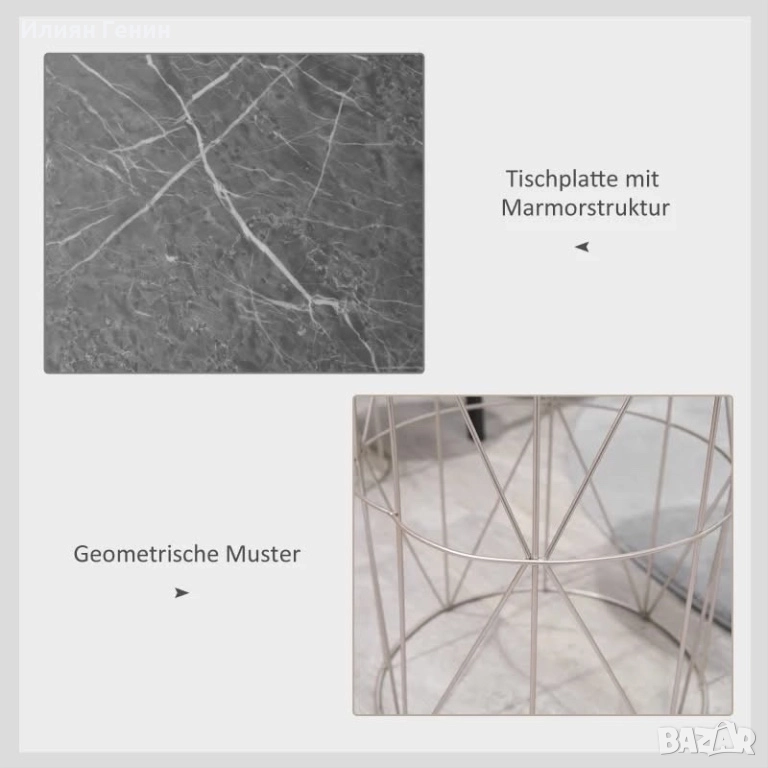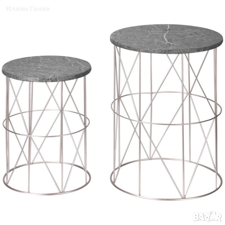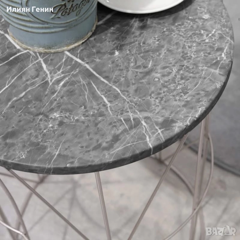 ✔ Две маси за вътрешен двор с плотове, имитиращи сив мрамор, и цилиндрични корпуси