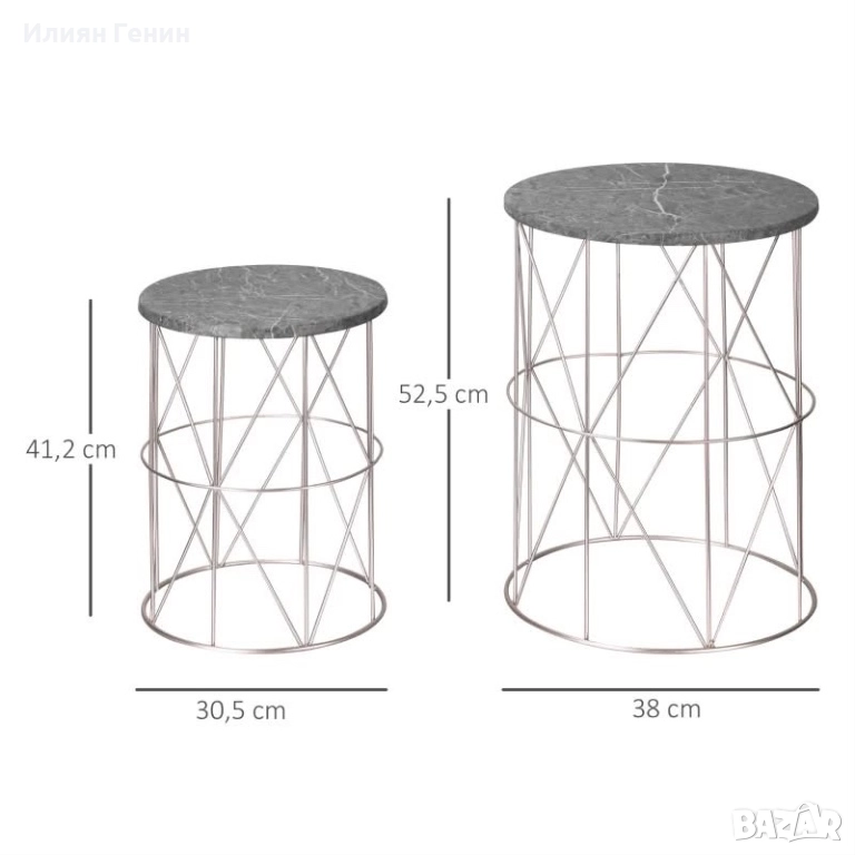 ДАННИ ЗА ПРОДУКТА: Общи размери: Ø38 x 52,5В см (по-голяма маса), Ø30,5 x 41,2В см (по-малка маса). Товароносимост: 50 кг (голяма), 40 кг (малка). Не е необходим монтаж.