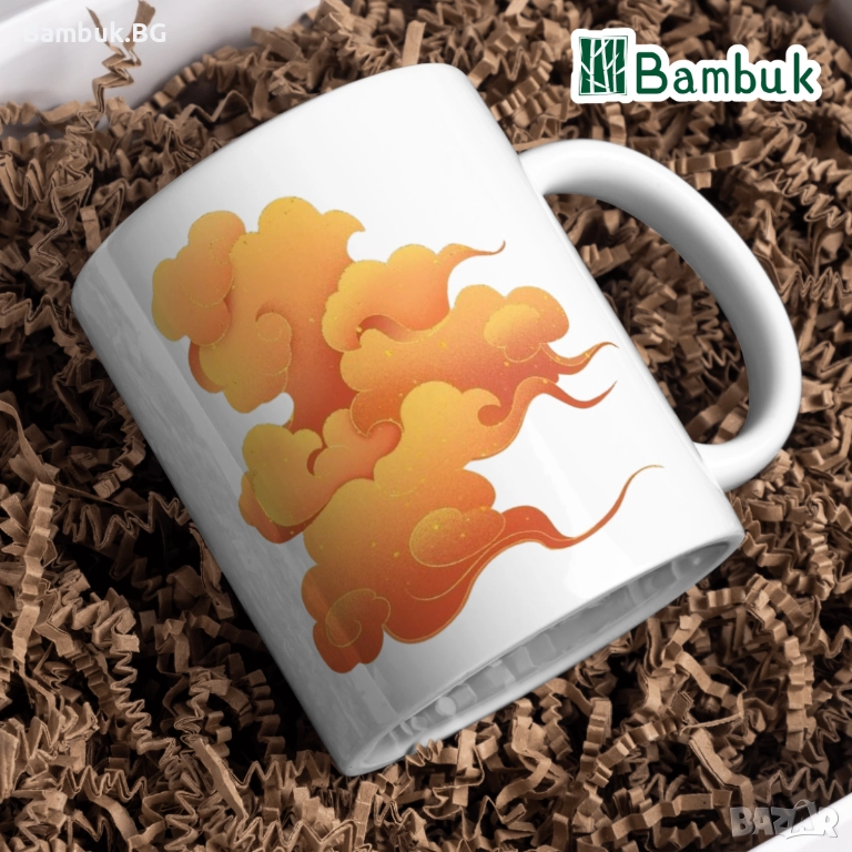 Вдъхновяваща чаша с йероглифен надпис ,,Аз уча китайски език” и мистични облаци в традиционния за китайските императори нюанс — жълто-оранжев.