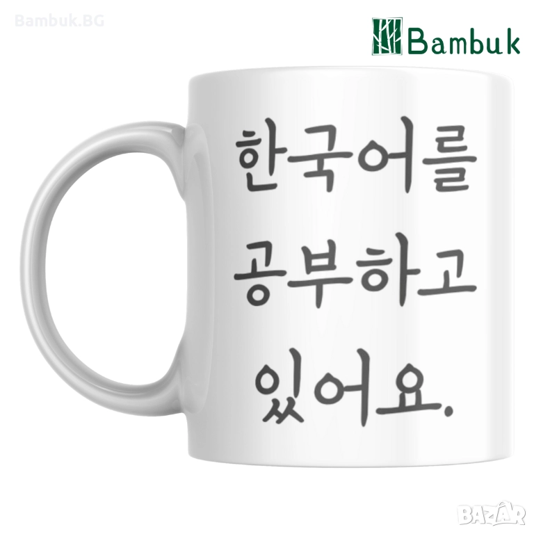 Красива разноцветна чаша с надпис ,,аз уча корейски език” и пано с многобройните символи на Корея.