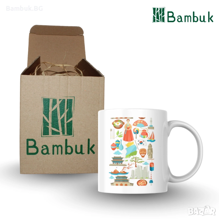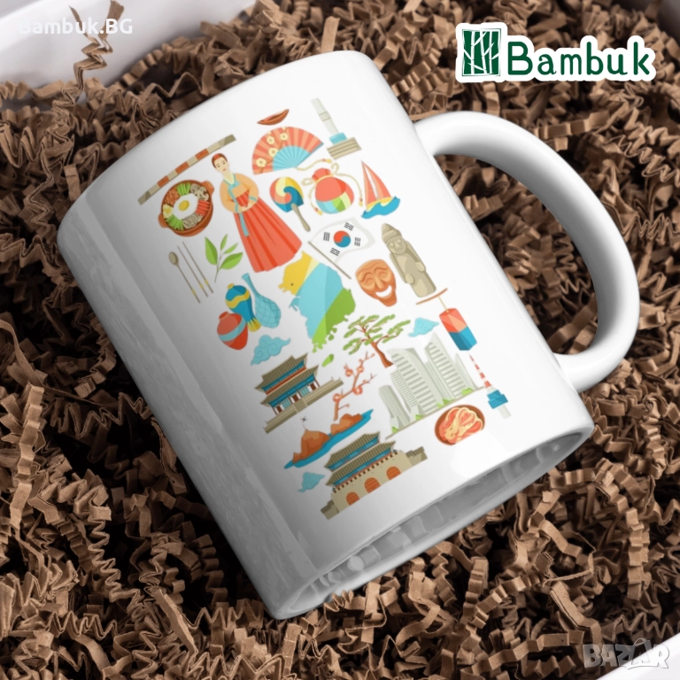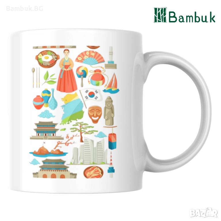 🟢 Част от символите, изобразени на чашата, са: корейският флаг, ханбок (наименованието на традиционното корейско облекло), корейското традиционно ястие бибимбап, корейско ветрило, dol hareubang (каменните статуи на остров Джеджу), хибискусът, който е националното цвете на Южна Корея, както и червеният бор.