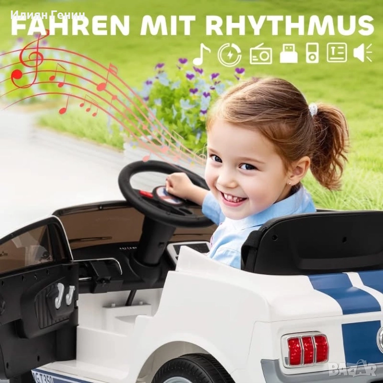 AIYAPLAY Детска електрическа кола Ford Shelby GT 350 12V с 2.4 GHz дистанционно управление, 2 мотора, клаксон, LED светлини, музика, бяла - 350.00лв.
