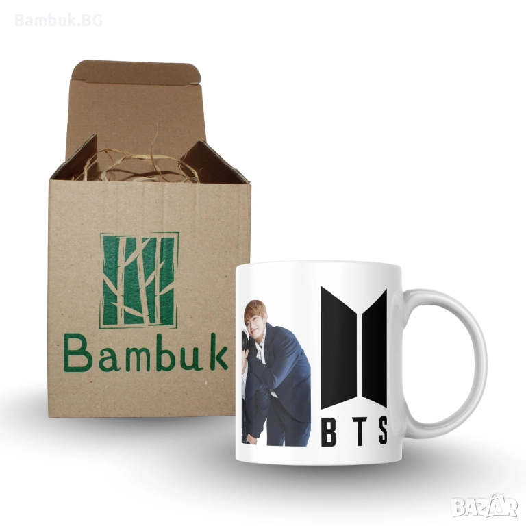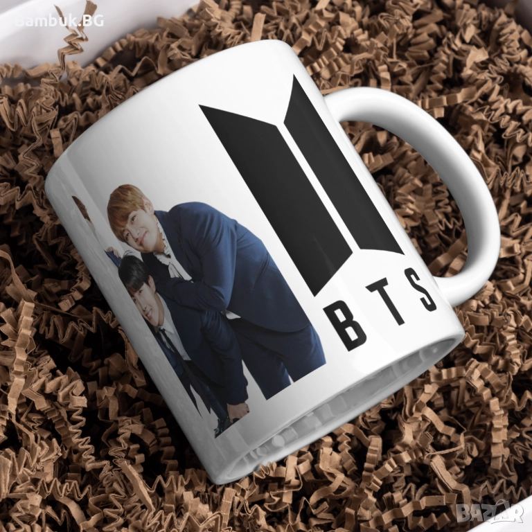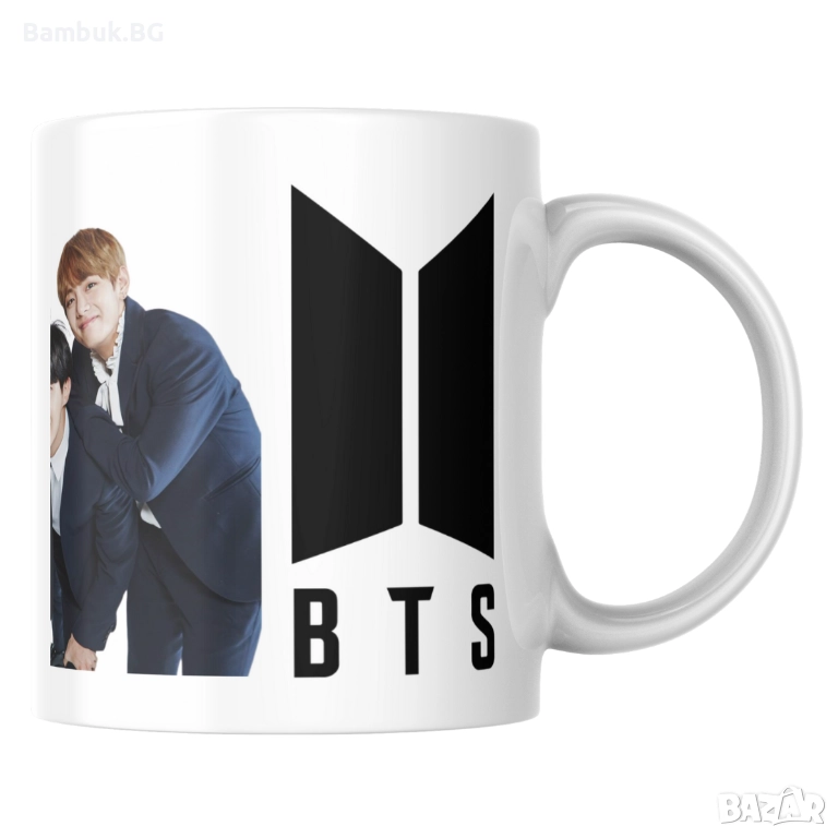 🟢 Дизайнът обхваща цялата чаша и включва логото на BTS в черно + снимка от една тяхна фотосесия.