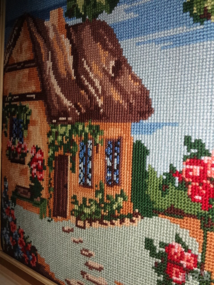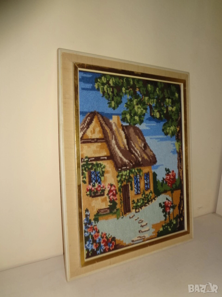 Красив ръчно шит гоблен от Германия. Представлява картина - пейзаж със старинна къща. Намира се в отлично състояние и е подходящ за украса и поставяне в дневната , къщата на село или вилата . Размери : височина - 50 см.; ширина - 40 см.