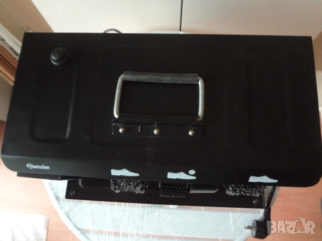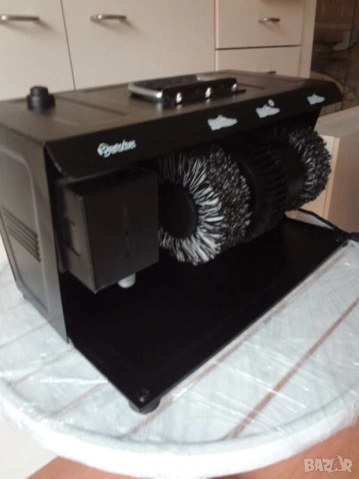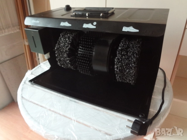 Чисто нова машина за почистване и полиране на обувки от Германия. Работи идеално и заменя досадното четкане на обувките ни от прах и пръст всяка сутрин преди да излезем. Има и контейнерче ,което може да се напълни с вакса или крем за полиране на обувките .Пуска се като се натиска с крак копчето върху корпуса отгоре и по същия начин се спира. . Машината е компактна за семейно ползване или за офиса и може да се постави в коридора или на балкона. Има си и дръжка върху капака с която лесно се пренася от едно помещение в друго при нужда . Размерите са - дължина- 45 см.; височина -30 см. ;дълбочина - 30 см. Необходимост е за всяко семейство, като пести времето на всички.