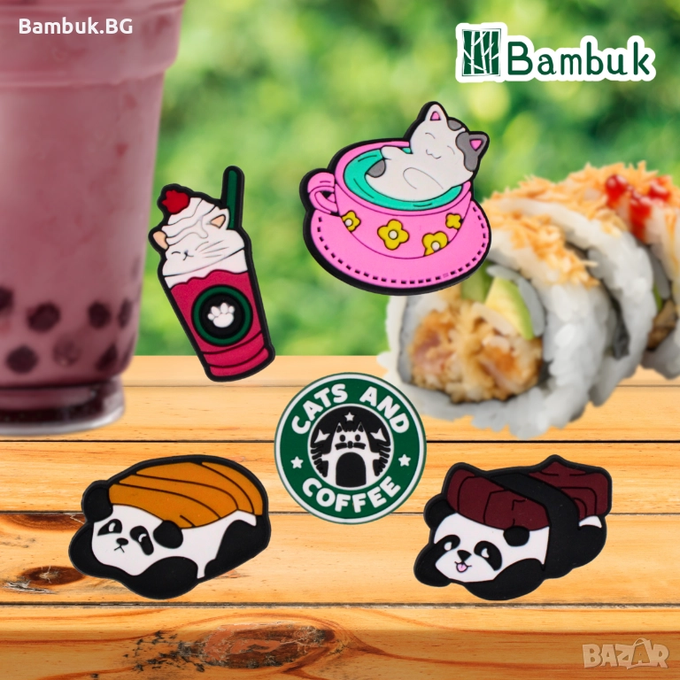 Чармове "Catpuccino and Pandasushi" ☕🐱 – очарователен комплект, съчетаващ котешка сладост и кафе настроение! Перфектни за любителите на котета, ароматното кафе и kawaii стила. Перфектни за декорация на несесери, чанти и обувки или колекционерски проекти.