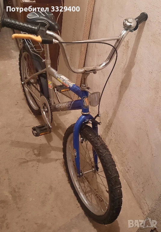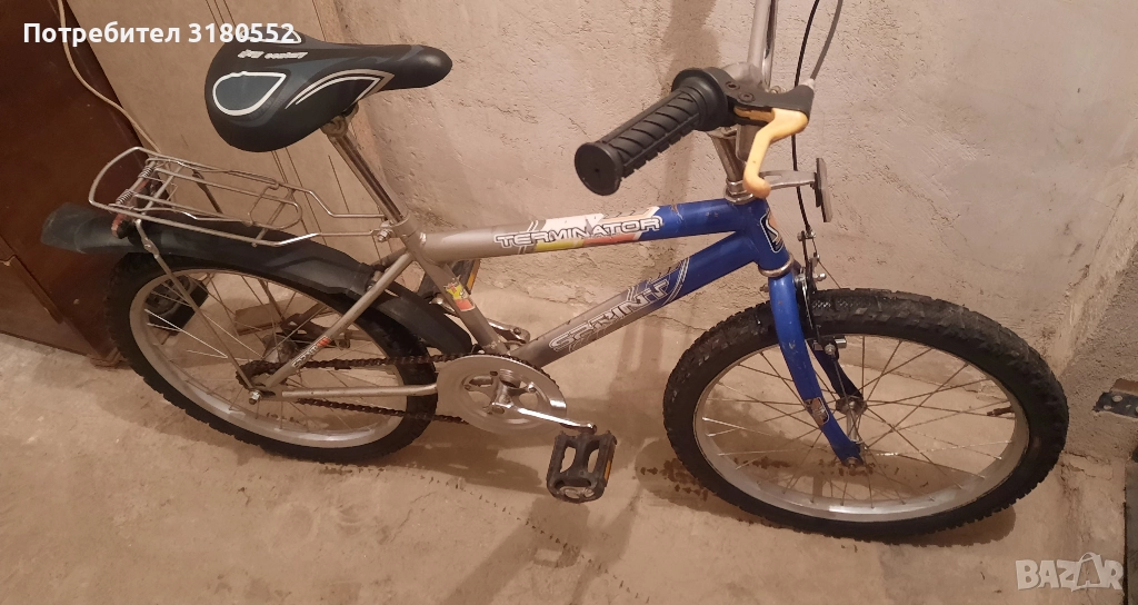 Продавам SPRINT Terminator - 18" детски велосипед с контра, с рамка размер S - 30 см. BMX - Кормило: Комфортна здрава седалка. 18" капли с перфектни гуми. Оборудван е със звънец, степенка за подпиране, заден калник и багажник. С предна ръчна спирачка е и задна с контра. В перфектно техническо състояние - готов за каране. Това е здрав и надежден детски велосипед, който е много запазен, видно и отснимките. За инфо – по телефона.