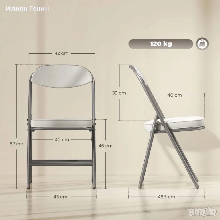 Създадени за дълготрайност: Благодарение на здравата метална рамка и стабилната триъгълна структура, тези тапицирани сгъваеми столове могат да издържат до 120 кг. Противоплъзгащите се крачета осигуряват стабилност и защитават пода.