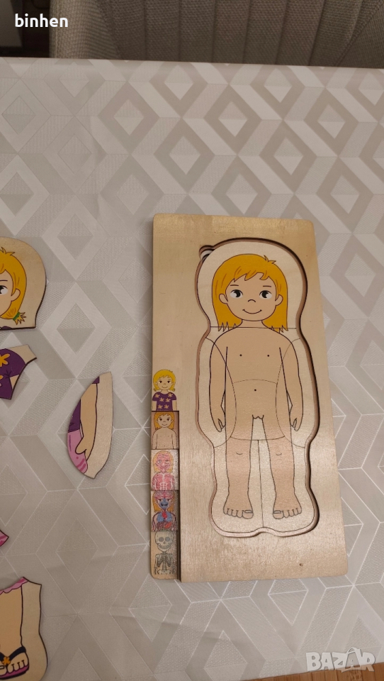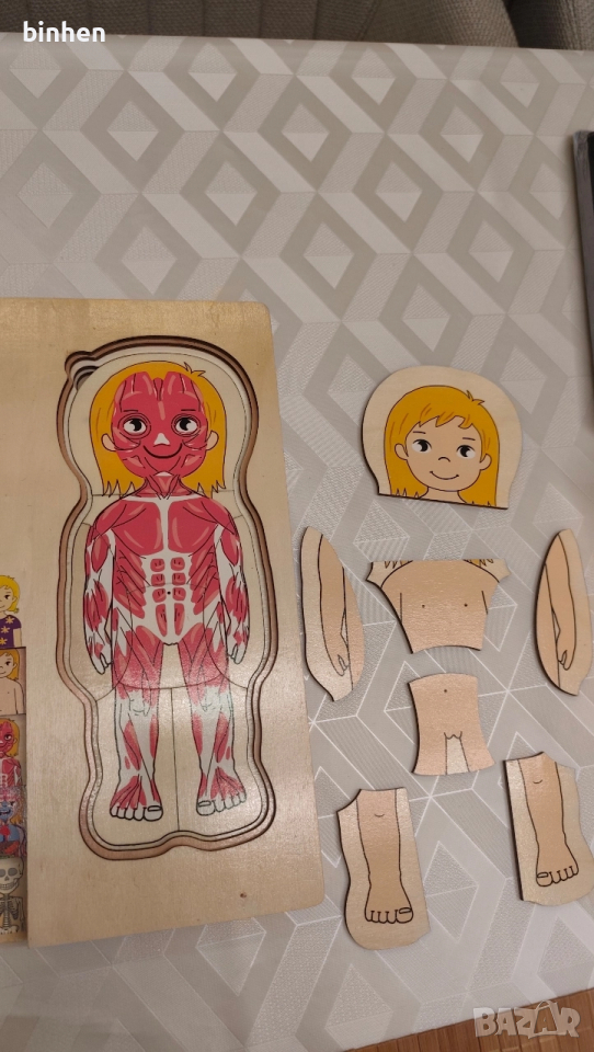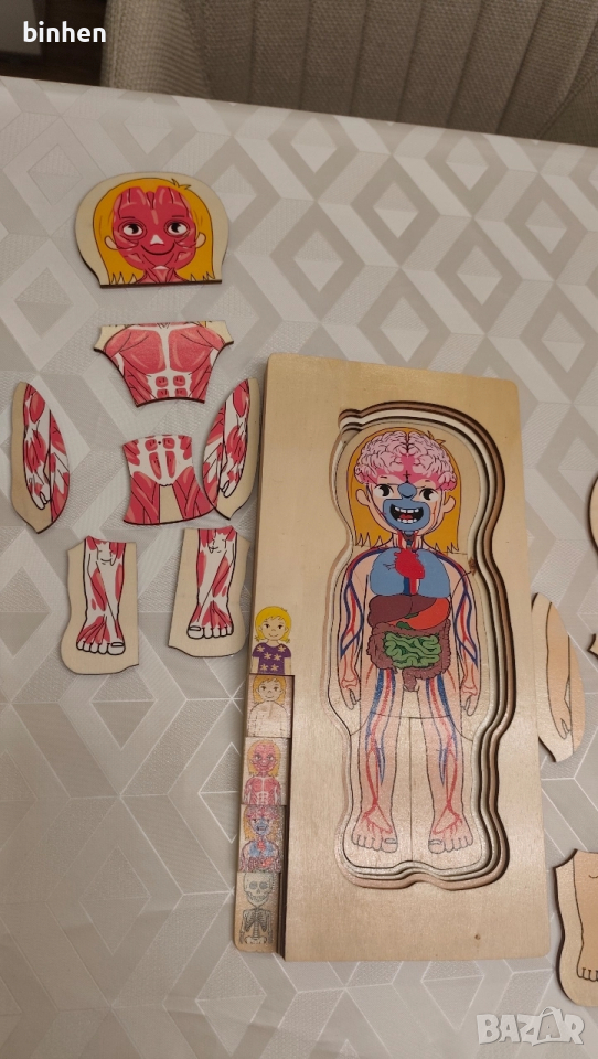 Детска образователна игра пъзел.Играта е подходяща за всички малки деца,показва и учи по много забавен начин структурата на човешкото тяло.Играта е дървена и в идеално състояние.Цена 18лв