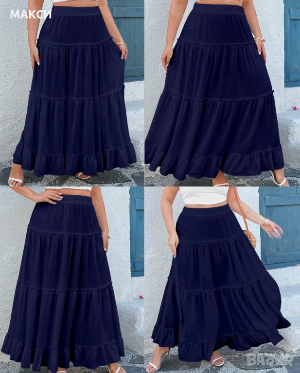 Макси елегантна ефирна дълга клоширана пола с широка ластична талия и волани в тъмно синьо, кафяво и → Обява 52579020