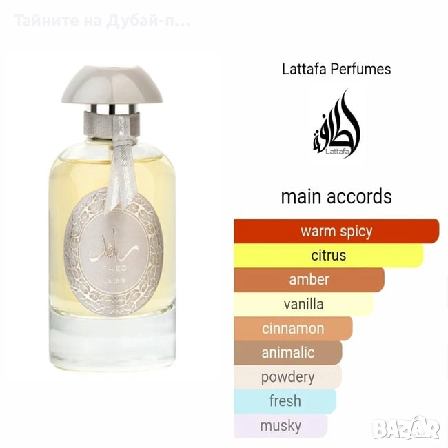 Lattafa Raed Silver е унисекс Eau de Parfum (100 мл), който съчетава свежите нотки на мандарина, цитрус и подправки с пикантно-цветна сърцевина от шафран, канела и карамфил. Финалът е топъл и дървесен — кожа, агар (oudh), амбрегрис, ванилия и мускус. Силата му е умерена, оставя трайна следа — подходящ за вечерни събития или специални моменти.