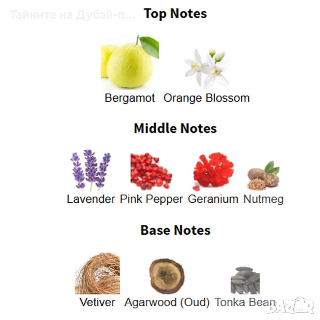 Базови нотки: Агарово дърво (Oud), Ветивер, Тонка боб