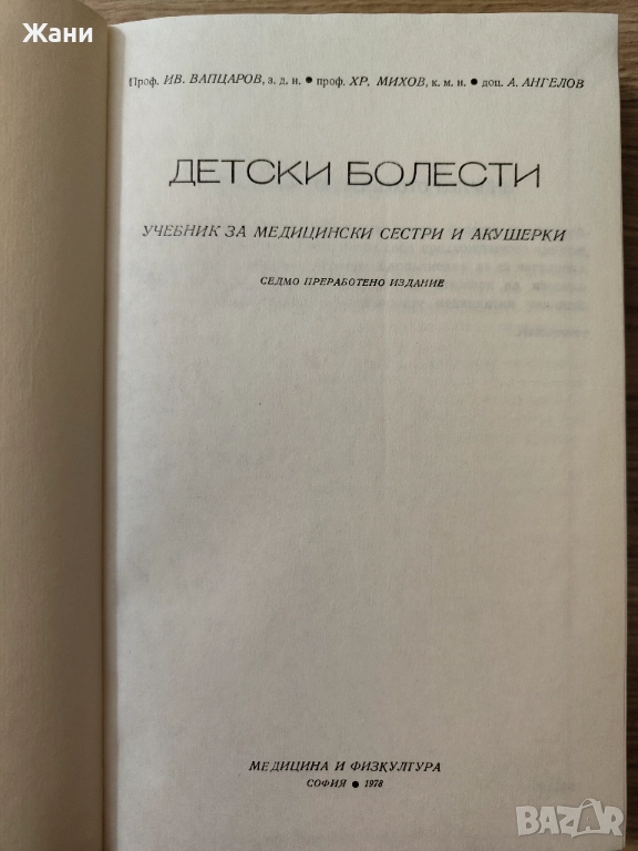Учебник за полувисшите медицински институти - за медицински сестри и акушерки. Автори: Ив.Вапцаров, Хр. Михов, А. Ангелов.Изд. Медицина и физкултура, София, 1978. В много добро състояние, чисто страници, няма скъсано.