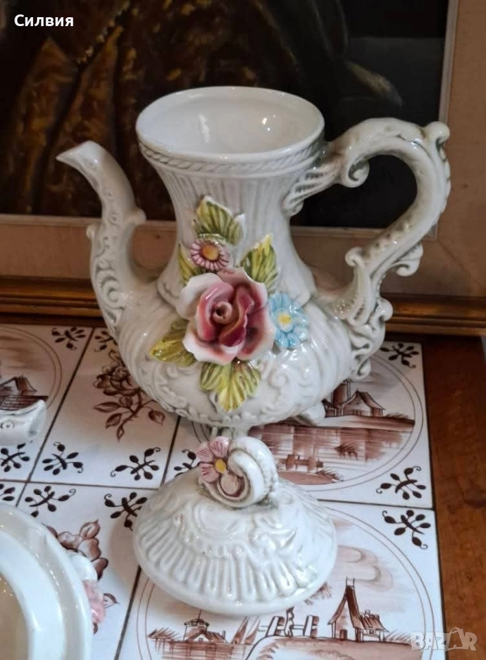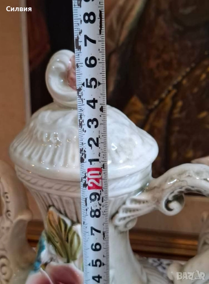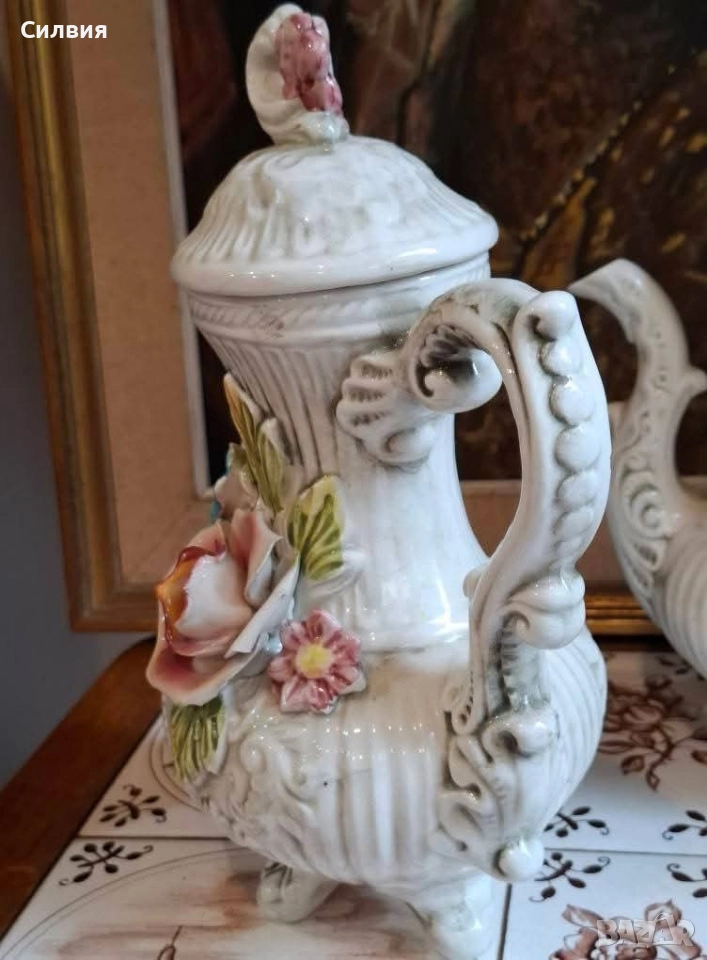 чайник/кана)... LCS Made in Italy. Този съд е произведение на изкуството – с прецизни релефни детайли и прекрасни, живописни 3D рози в нежни тонове. Не просто съд, а акцент, който разказва история. Поставен върху плота, масата или рафта, той създава неповторима атмосфера. Прекрасен и като ваза. Не пропускайте да добавите този уникален винтидж съд към вашата колекция! Височина 26,5см с капак. Цена- 8️⃣0️⃣лв.40,90 € ღꕥ⊱❥─❥⊱💜✿⊱╮☆♪ ░L░o░V░e░❥─❥⊱💜✿⊱╮💜☆♪ღ💜ღ꧂