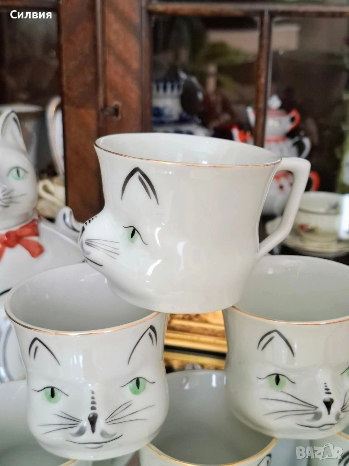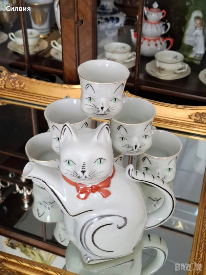 Елегантност и закачливост в едно – този очарователен порцеланов комплект внася усмивка и топлина във всеки дом. Изработен е през 60-те години в „Изида“ и впечатлява с оригиналния си дизайн във формата на 🐈 с нежни зелени очи и червена панделка. Всяка чашка е украсена с изящно рисувано 🐈 личице, което придава особена романтика и характер на сервиза.