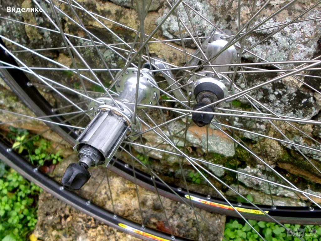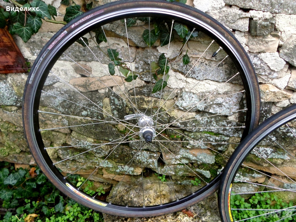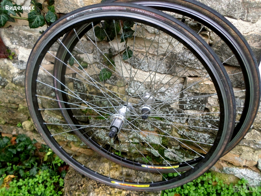 Шосейни капли клинчер с шини /32 спици/Mavic и главини Shimano Tiagra/предна/, Campagnolo Chorus/задна/. Състояние "слагаш и караш"! Имам свободни Кампа венци /9 и 10 ск/. Като тегло не знам колко са ,но шините са едни от най здравите, т.е. няма да са много леки.