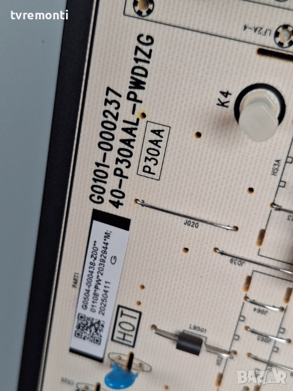 POWER BOARD G0101-000237 40-P30AAL-PWD1ZG G0504-000438 за 55-инчов телевизор TCL Модел 55Q6C, с дисплей LVU550NDJL Платката е използвана, но гарантирано работеща, демонтирана от телевизор със счупен дисплей. Тествана е от нашия техник.