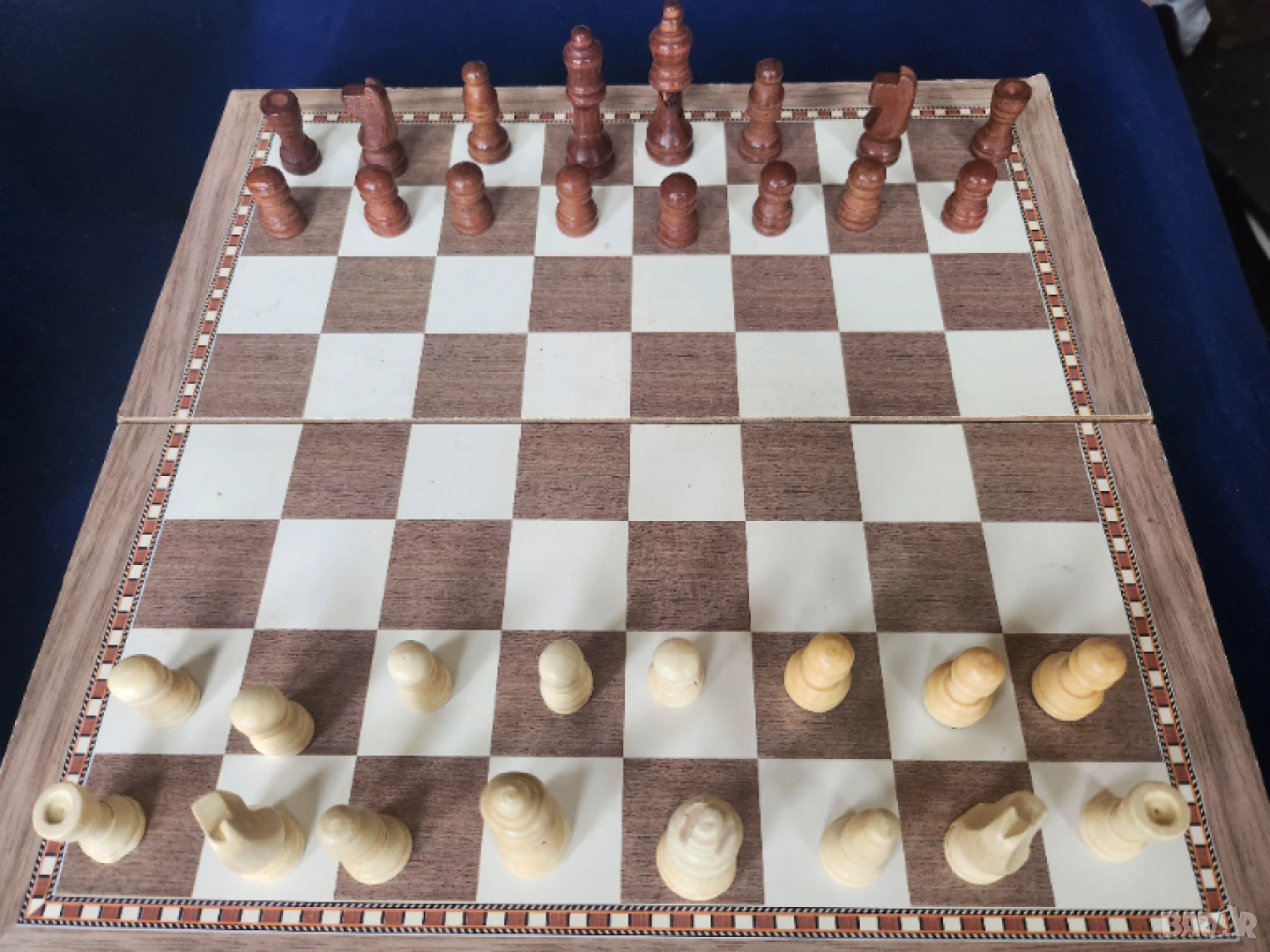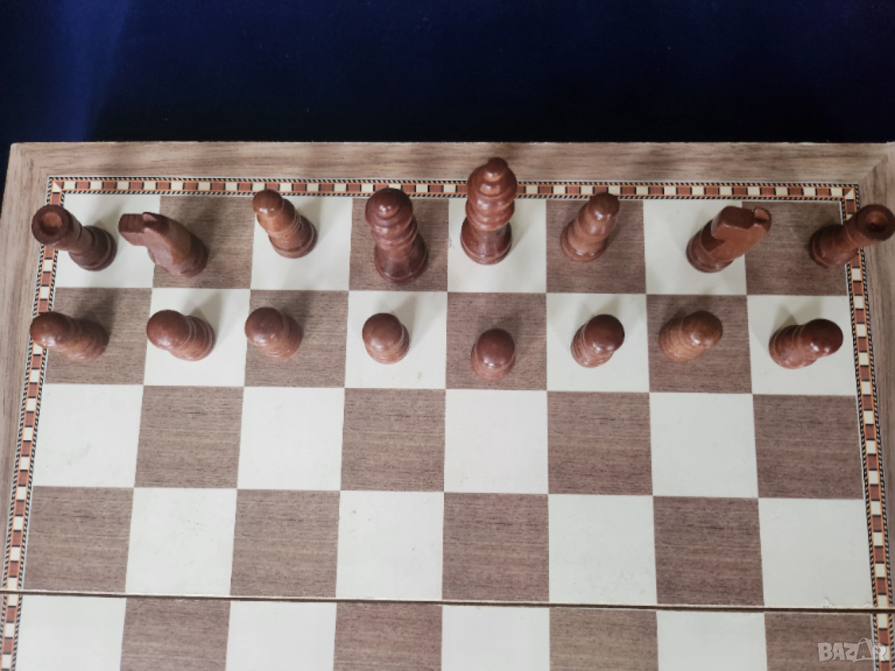 фигурите за шах са дървени ( 3 бели пешки са малко по високи)