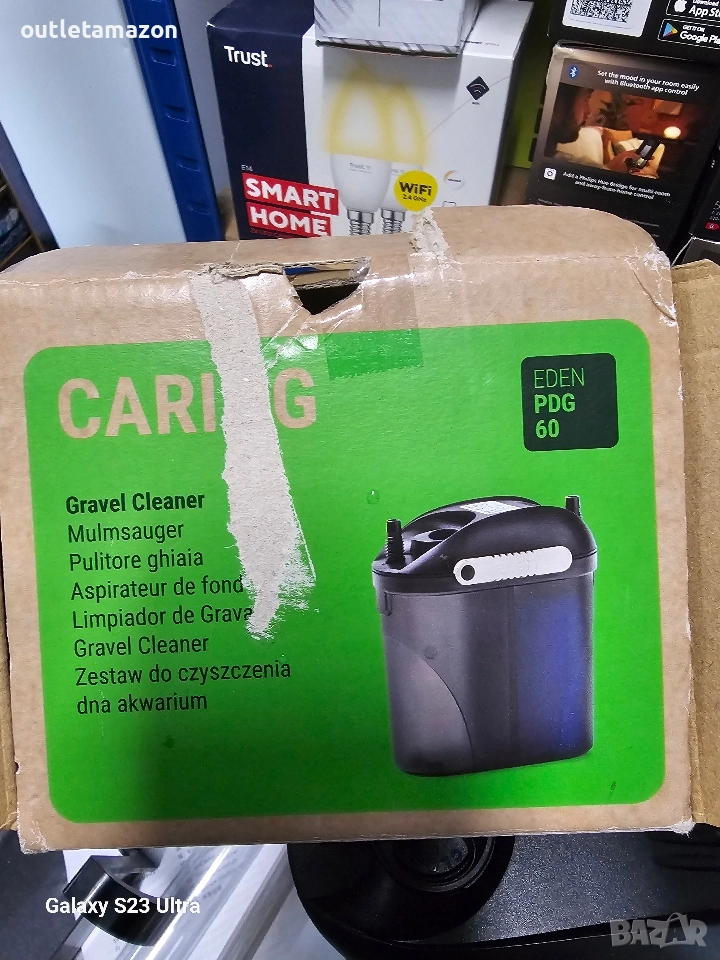 аквариум Уредът за почистване на чакъл EDEN PDG 60 е идеалното решение за поддържане на аквариумния субстрат чист, без да нарушава чакъла. Ефективно премахва утайки, остатъци от храна и други примеси, като допринася за здравословна водна среда. Ефективно почистване Отстранява остатъци и утайки, без да уврежда основата. Вграден гъбест филтър Улавя замърсяванията и връща чистата вода в аквариума.Лесен достъп до труднодостъпни места Включва две смукателни тръби (ø 13 mm и ø 25 mm) за прецизно почистване. Пълен комплект Доставя се оборудван с маркучи и монтажна скоба за бърз и лесен монтаж. Инструкции за употреба: Прикрепете устройството към аквариума с помощта на монтажната скоба. Изберете подходящата смукателна тръба (ø 13 mm или ø 25 mm). Внимателно преместете прахосмукачката върху субстрата, за да съберете замърсяванията. Почиствайте филтъра периодично за оптимална работа.