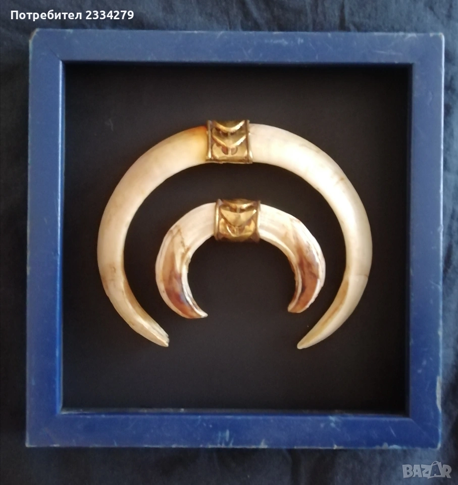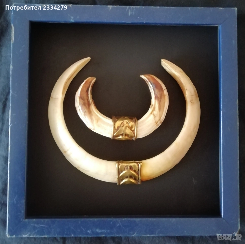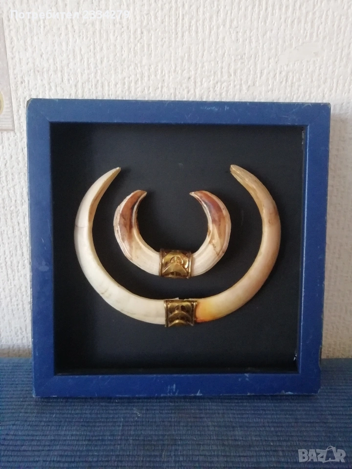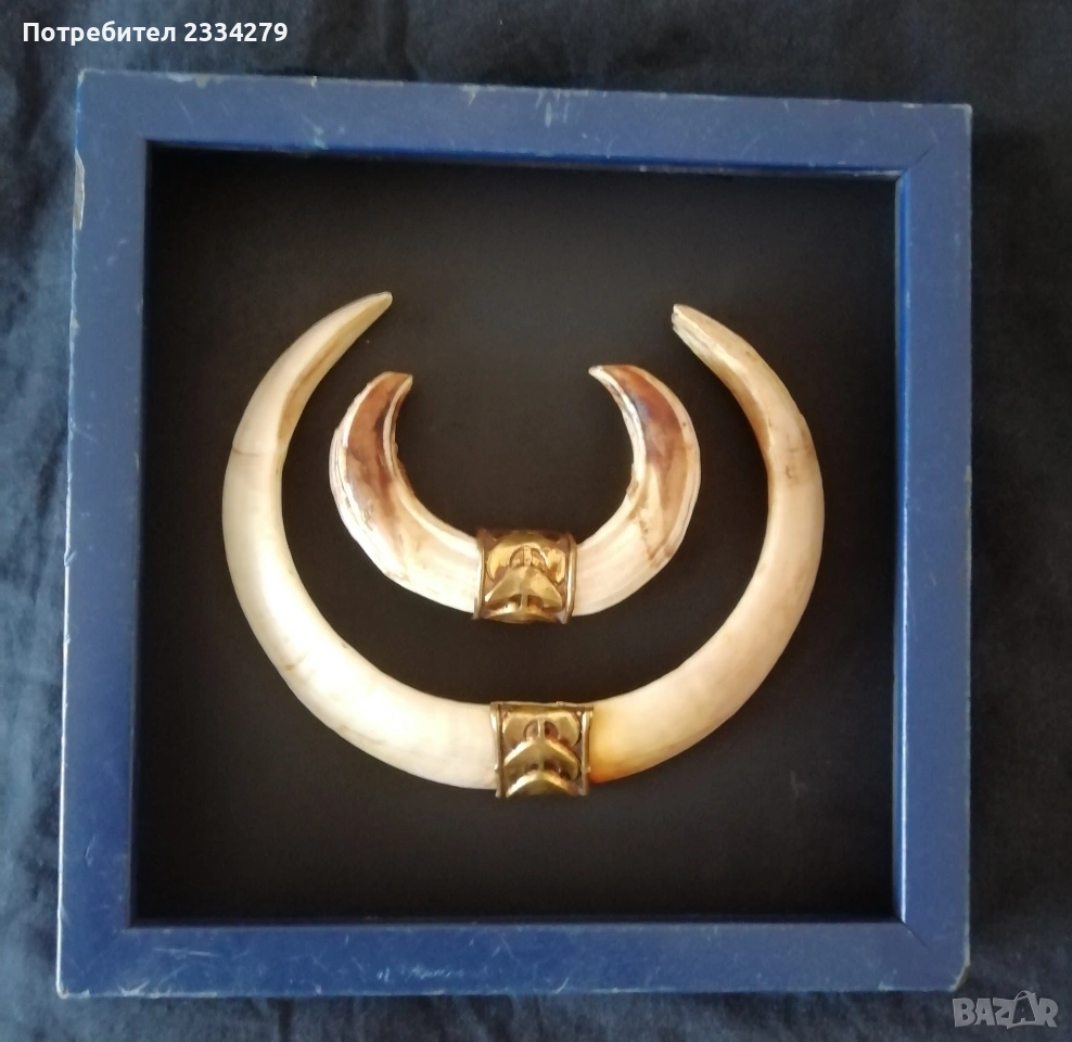 трофейчета от 70-80години, цена за брой 17€.; N:3 единичен еленски рог с 5 разклонения дължина 77см., дебелина 18см., цена 40€лв.; N:4 рогца от саръндаци на дървени поставки цена 16€. за брой; N:5 роги на бодлар дълги 37см, 30см.,22см., цена за двата по големи за двете 8€., по малките за двете 5€.; N:6 рогца от саръндаци от 19 до 23см., цена 3€. за брой.; N:7 зъби от диво прасе, глиган поставени в дървена рамка, размери на зъбите: големите 15см., малките 10см., цена 33€.