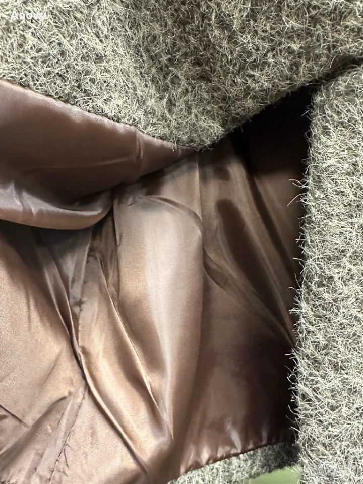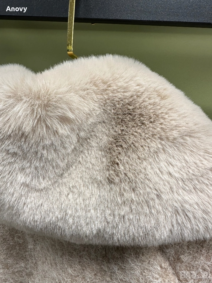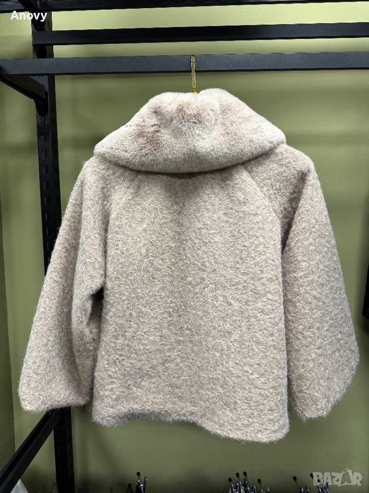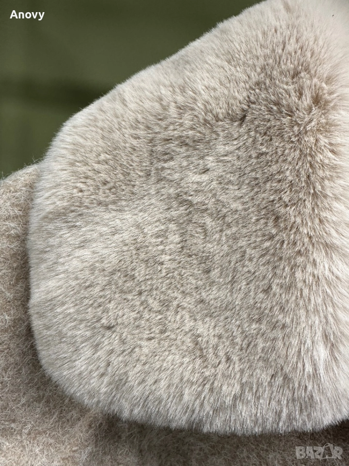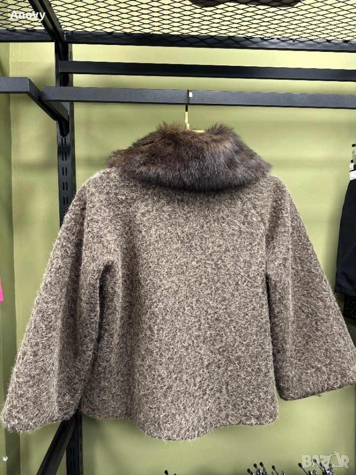 Топло късо дамско палто с красива широка пухена яка (висок клас еко пух). Материя тип „мохер“ — мека, плътна и стои много елегантно.