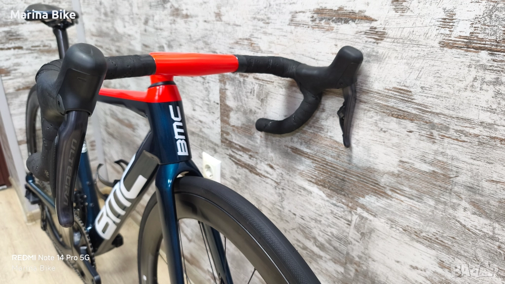 Велосипедът е сглобяван по индивидуален проект, оборудван със чисто нов пълен електронен монтаж 2х12 скорости Shimano Ultegra R8170 Di2 с хидравлични дискови спирачки, карбонов интегриран кормилен модул BMC ICS и карбонова седалка Fi:zi'k.