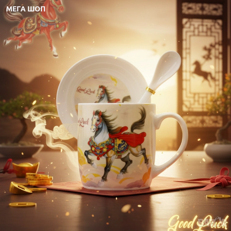 Подаръчен късметлийски порцеланов комплект – чаша, чинийка и лъжичка с празничен дизайн на коне → Обява 52583989