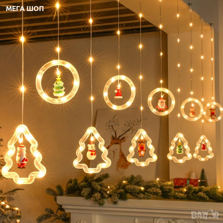 Светещ коледен гирлянд с рингове и малки коледни фигурки / 5 броя коледни елхи и 5 броя рингове с иг → Обява 52584173