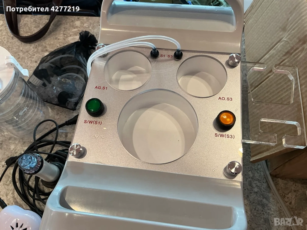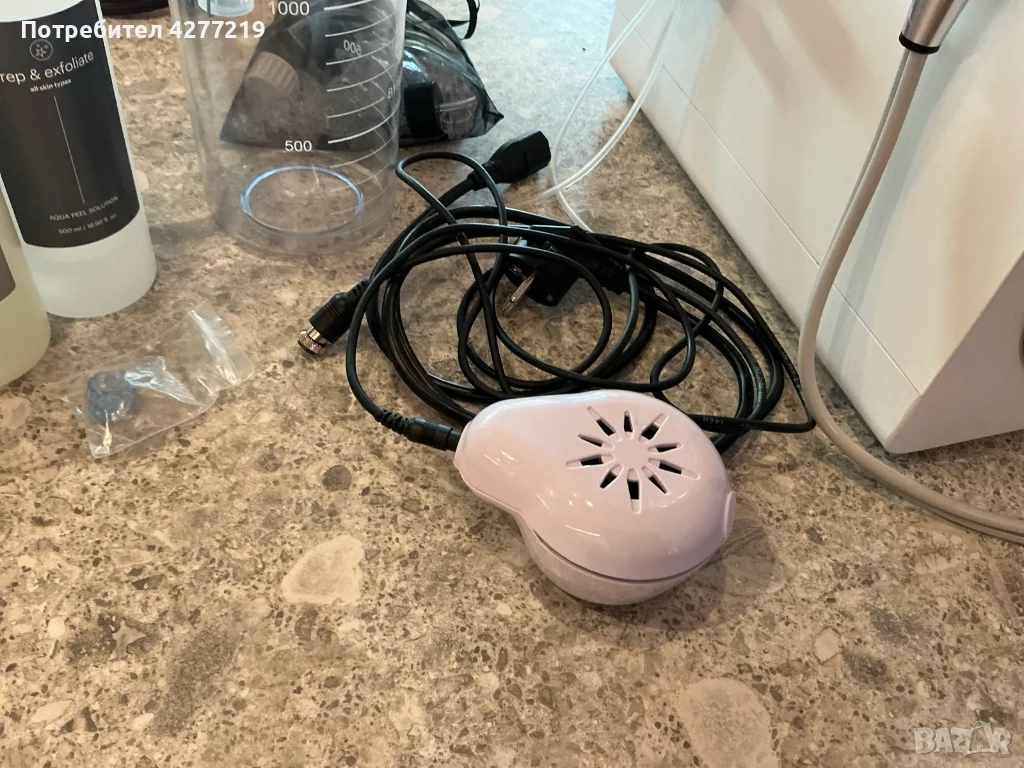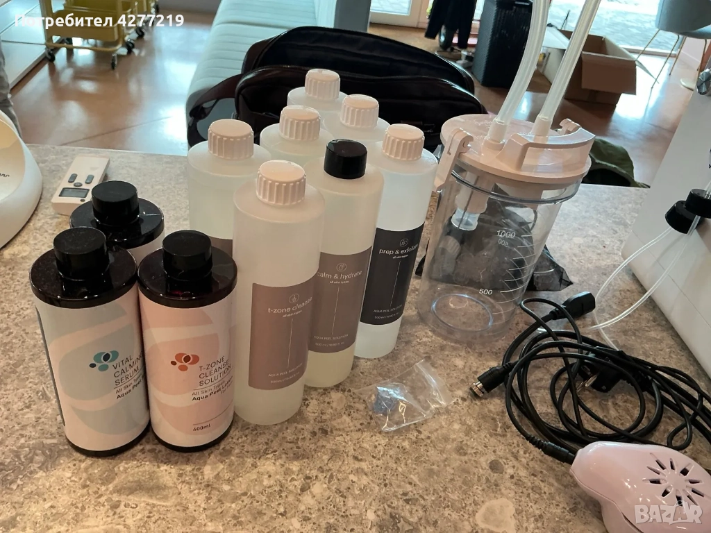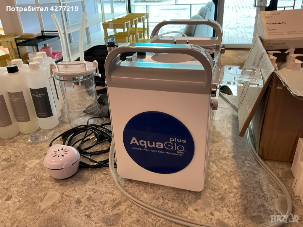 - Обработване на лицето с почистващия и ексфолиращ разтвор от апаратурата Aqua Glo. Основни съставки: Млечна киселина, алфа-хидрокси киселини, водорасли, мая, зелен чай.