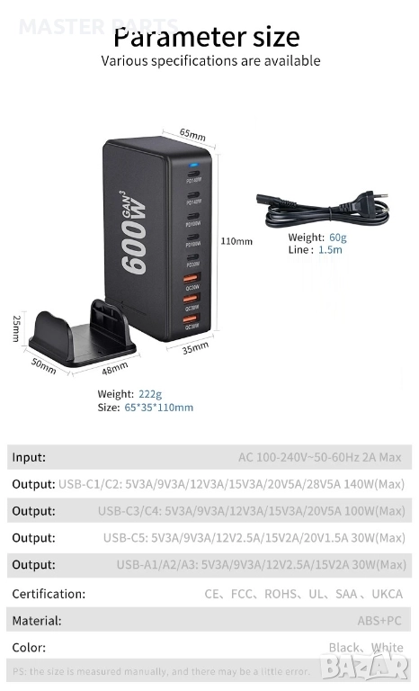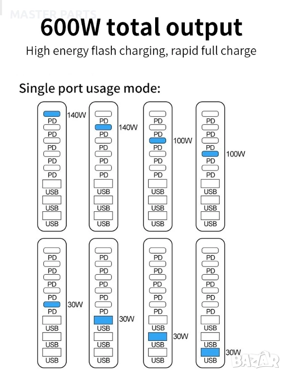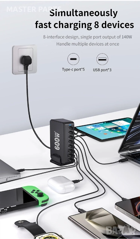 Представяме Ви новото 600W GaN3 PD 3.1 зарядно устройство – многофункционално зарядно устройство, което трансформира начина, по който зареждате! Един порт осигурява до 140W, а общата мощност е 600W.