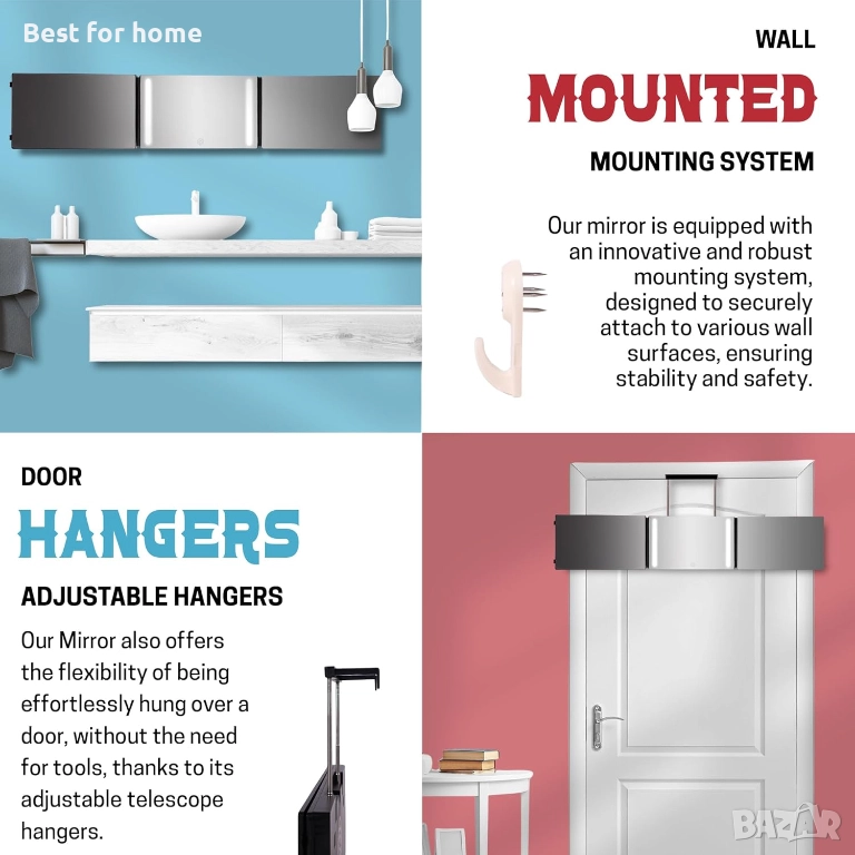 【Кристално чисто стъкло】 Нашето 3-посочно огледало се отличава със стъкло без изкривявания за превъзходна яснота, оставяйки пластмасовите конкуренти далеч от вас. Вижте задната част на главата си с истински детайли.