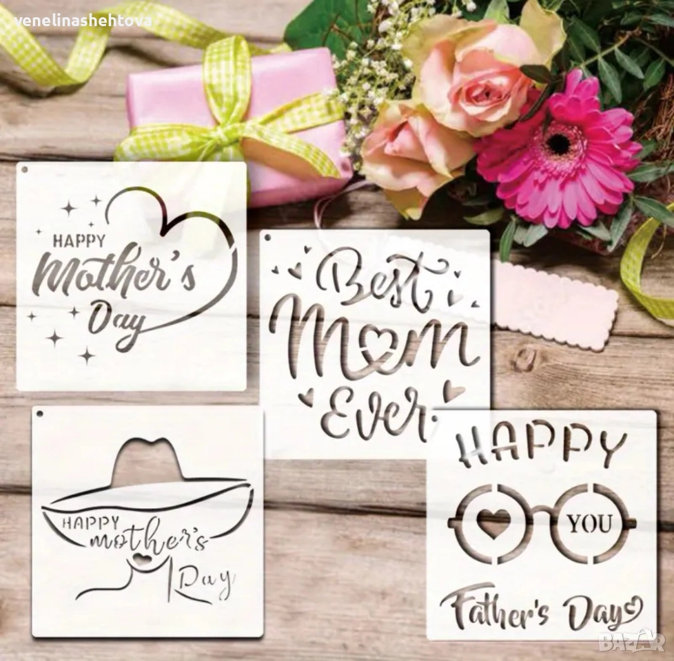 Шаблони за деня на майката, бащата, за многократна утотреба. Подходящи за декориране на различни повърхности като торти, кексове, скрапбукинг, картички, текстил и др.
