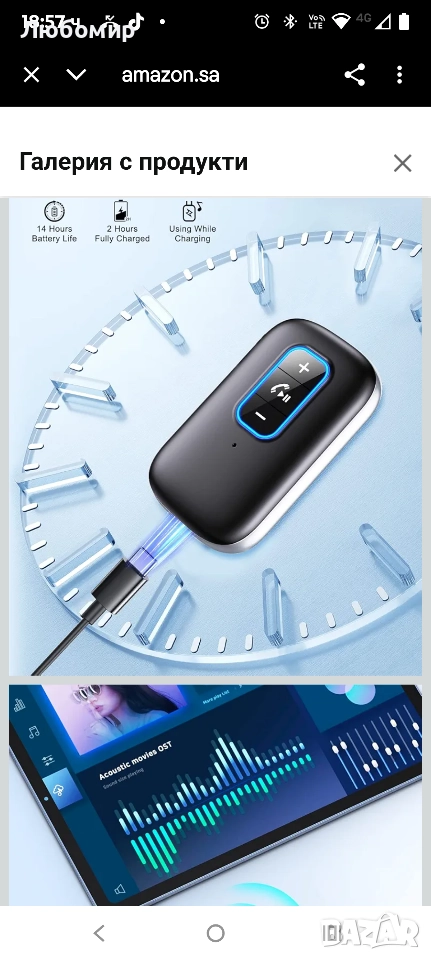 Bluetooth аудио приемник се зарежда напълно само за 2 часа и издържа 14 часа (включен е кабел за зареждане TYPE-C). По-удобното е, че този Bluetooth аудио адаптер може да се използва и по време на зареждане.