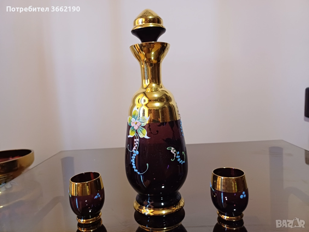 Отлично запазен сет Мурано от шише с височина 26 см. и две чашки с височина 5 см. и широчина 4 см. В отлично състояние и много красив цвят. Част от лична колекция.Моля, разгледайте и другите ми обяви!