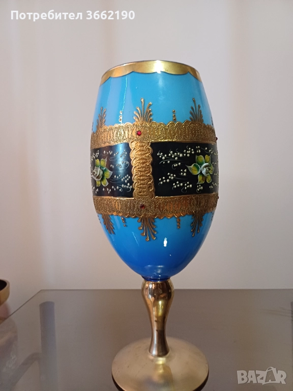 Стара ваза Мурано в много нежен син цвят и красива орнаментика.Височина 40 см. и широчина на отвора 13 см. Мисля, че основата не е в оригинално състояние, затова и цената е такава. Разликата обаче е почти незабелижима. Част от лична колекция.Моля, разгледайте и другите ми обяви!