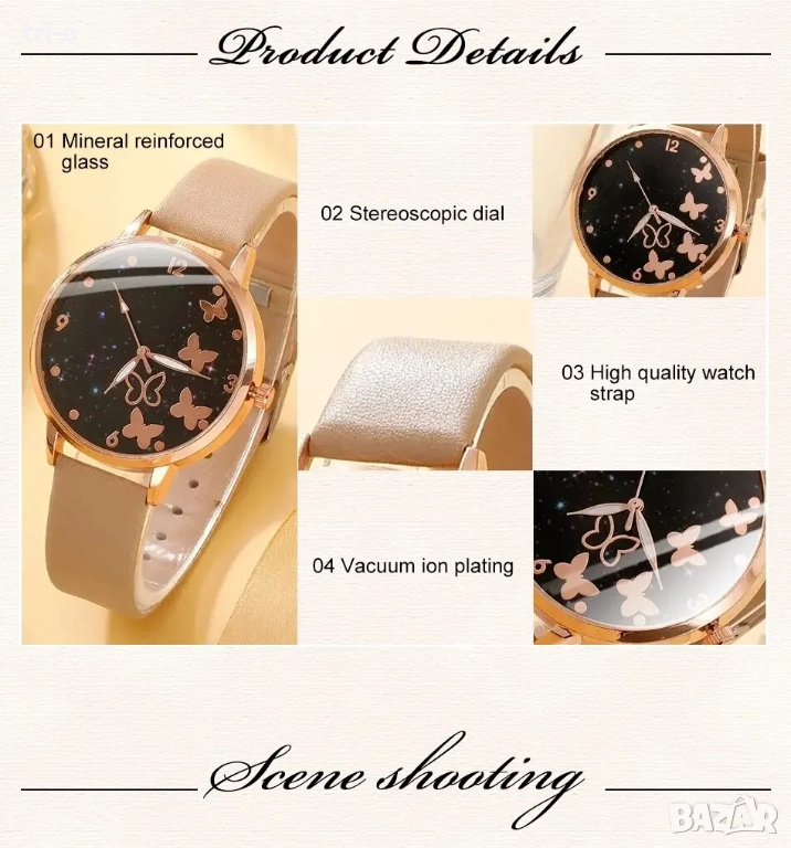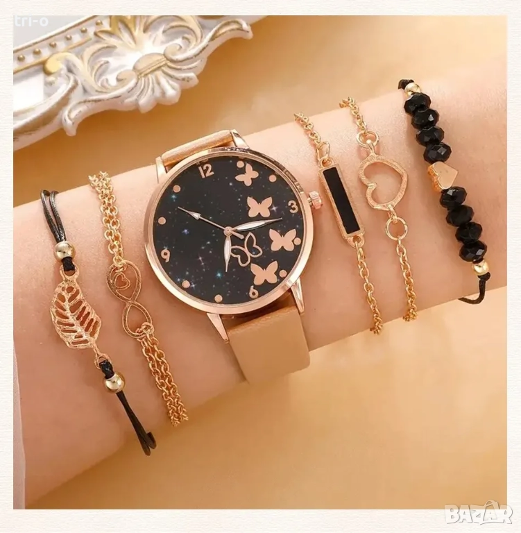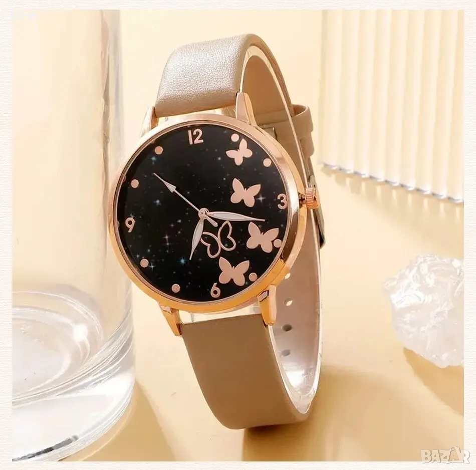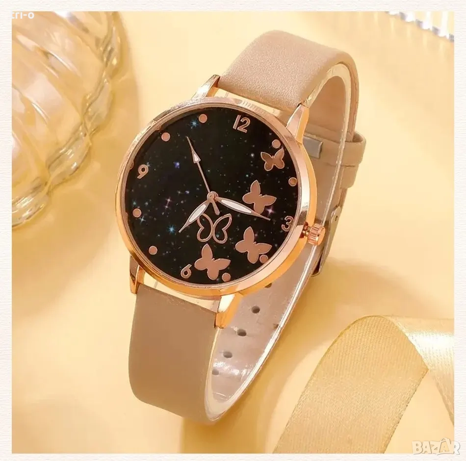 Дамски моден кварцов часовник с пеперуди + 5 гривни, без кутия