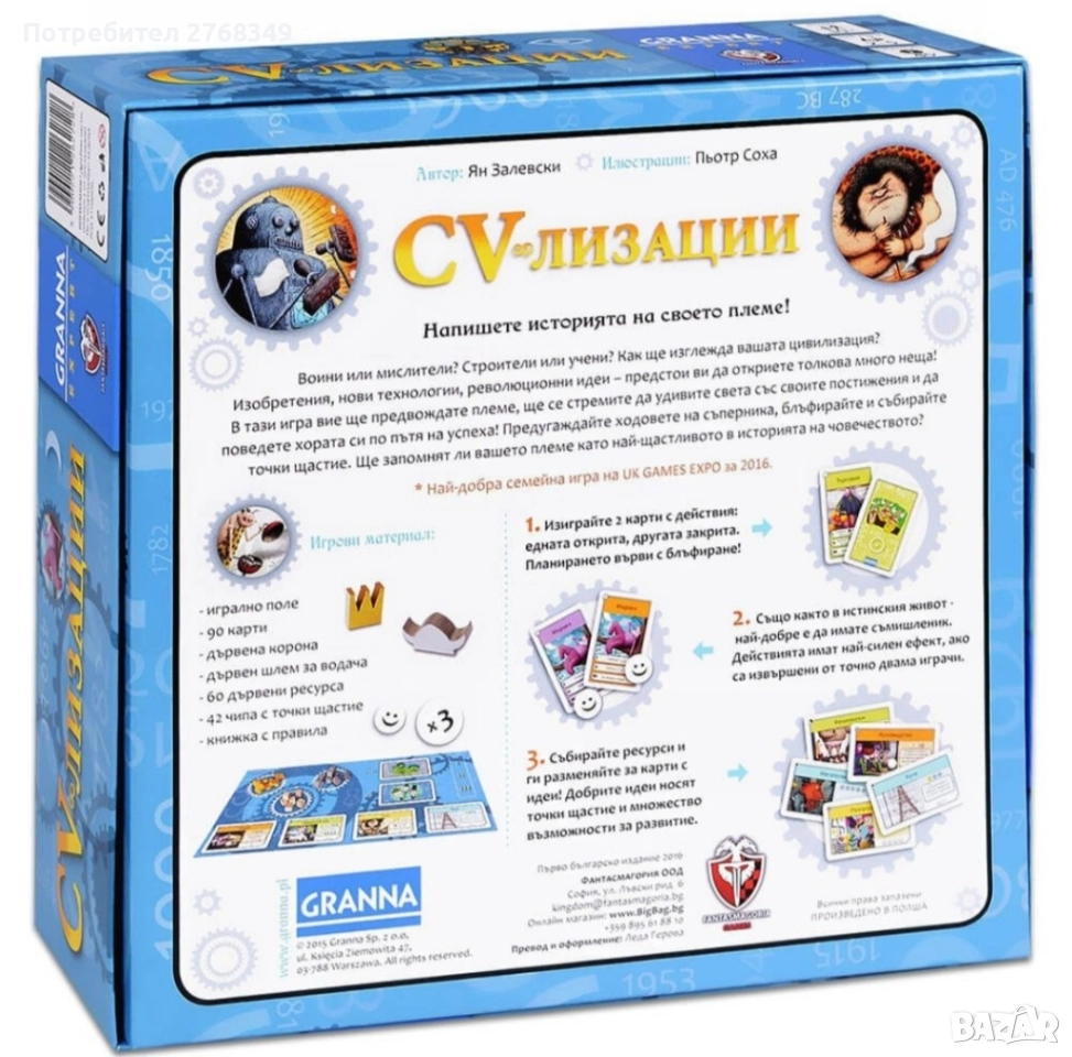 CV-лизации е интересна семейна или приятелска игра. В нея печелите повече точки като си партнирате с някого. Обаче ще има обратен ефект ако повече от един човек разкрие стратегията ви и реши да я използва. Станете велики лидери на племе само с няколко хода игра. Това е играта, в която вие ще имате собствено племе, което ще управлявате и целта ви ще е да покажете пред света невероятните си постижения.Тук в Цивилизации имате две действия – да изиграете една открита карта от вашата ръка и една закрита. Управлявайте племето си умно и тактично, използвайте заблуда срещу противника и спечелете повече точки щастие.