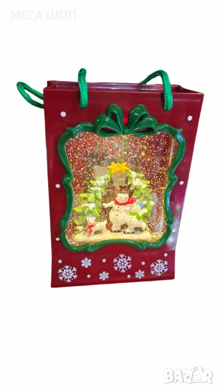 Празнична Коледна декорация във вид на подаръчна чанта със светлини и снежен ефект → Обява 52587358