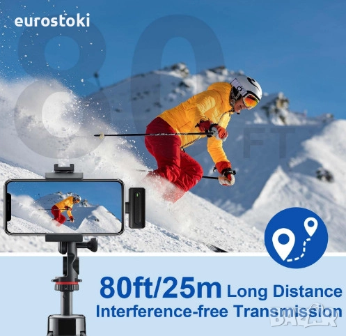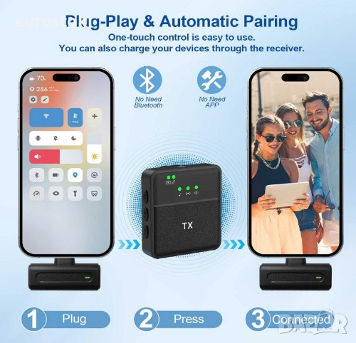 Широко съвместим. Безжичният микрофон за iPhone и Android се предлага с USB-C към Lightning адаптер. Съвместим е със смартфони с Android (като Samsung, Huawei, Honor, Xiaomi и др.), iPhone, iPad.