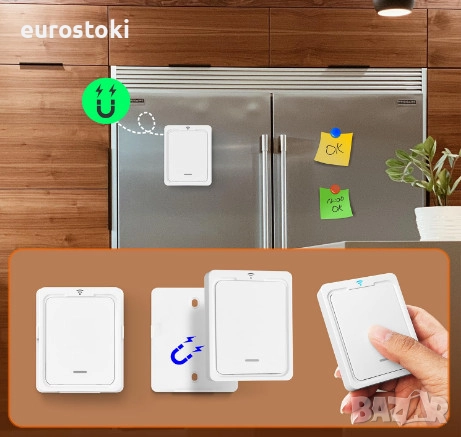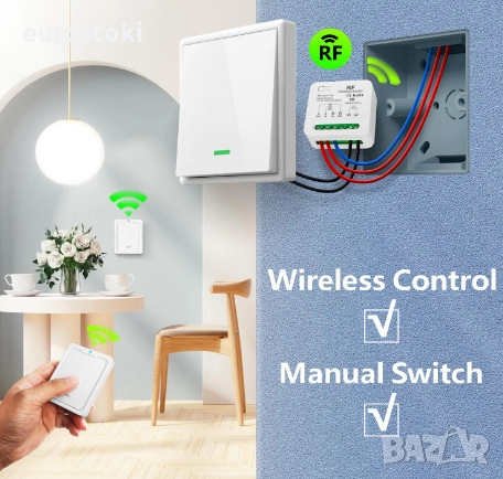 Множествен контрол. Всеки приемник може да съхранява около 10 безжични превключвателя. Така че можете да споделяте превключвателите със семейството си. Всички можете дистанционно да управлявате устройството, свързано към приемника. И един предавател може също да управлява множество приемници. Например, един превключвател, инсталиран на стената близо до вратата на спалнята, а друг поставен на нощното шкафче.