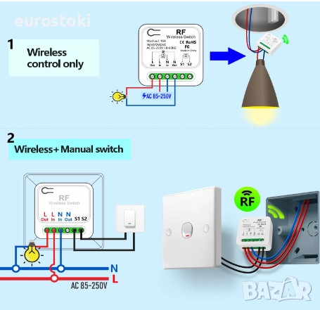 Безжичен RF ключ за осветление 433 MHz. Можете дистанционно да включвате/изключвате осветлението или други устройства, свързани към релейния приемник, чрез дистанционното управление. Стабилна и надеждна работа с висока чувствителност на приемане (> -97 dBm). Предаване на радиочестотен сигнал. Силният сигнал може да преминава през стени, подове, врати и др. Може да се управлява от разстояние 50 м на открито.