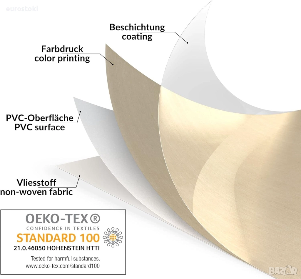 4-слойна: повърхност с релефен ефект от първокласен текстил. Долна страна: полар. Междинен слой: висококачествен печат + винилово фолио.