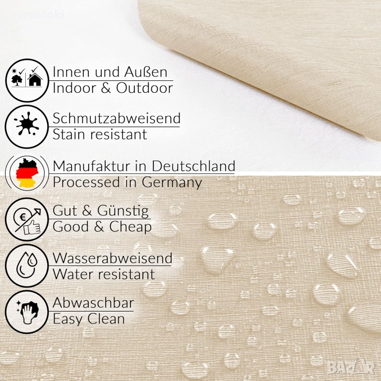 Устойчив на атмосферни влияния: може да се използва на закрито и на открито като градинска покривка, покривка за балкон, покривка за къмпинг.