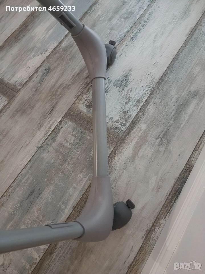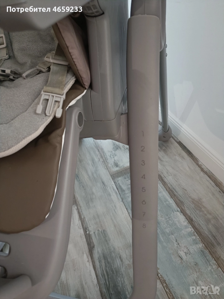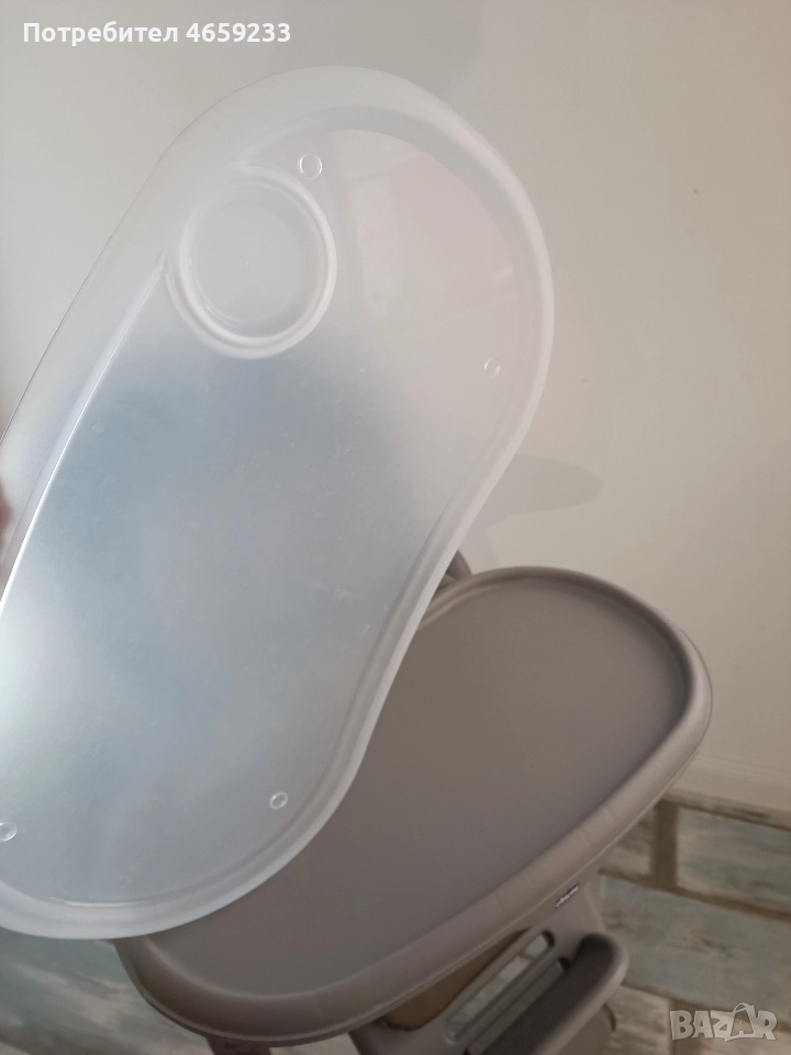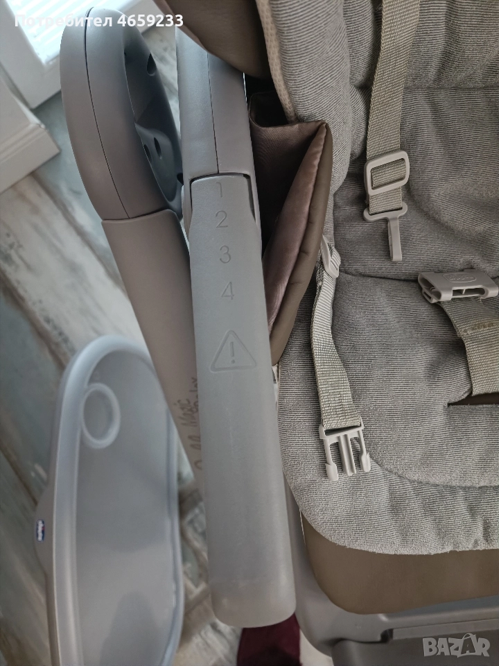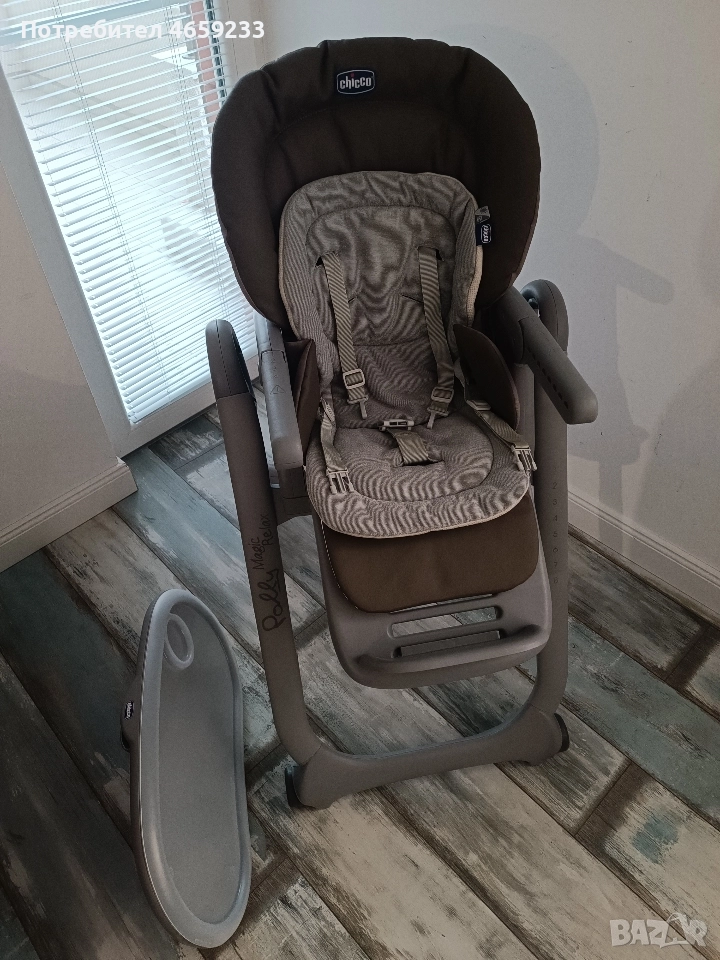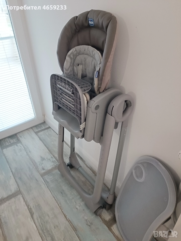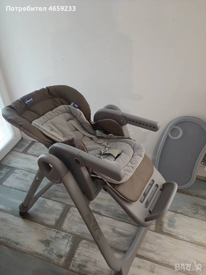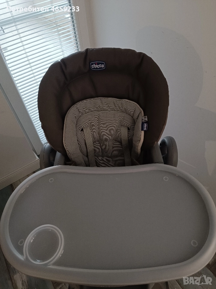 Столът за хранене е използван, но е запазен и е много функционален. От италианската известна марка Chicco. Цените на столчета за хранене на тази марка са около 400лв 500лв и т.н. Освен за деца, които вече се хранят седнали, може да се използва и за 0+ години, понеже седалката може да се настрои в легнало положение. Като се хранете може да поставите бебенцето на стола, като в легло и да се храните спокойно на масата, като е до Вас. Столът е на колелца за лесно пренасяне и спирачки на задните колела за да не мръдне. Може да настроите височината на седалката според масата или например сте седнали на дивана и настройвате на ниво което ще Ви е удобно. Нивата са 8. Масичката може да се махне и да се настрои на 4 нива, колко да е близо или широко, мястото за сядане. Масата има горна част от пластмаса, който може да се изкара и да се измие на мивката за удобство на майките. Има място за крака, има също 4 степена, може и да се махне изцяло. На седалката има мека част от кожа и по малка мека част, която е от плат и може да се изкара и да се пере. Има каижки за вързане. Лесно се прибира, за да поеме по-малко място.