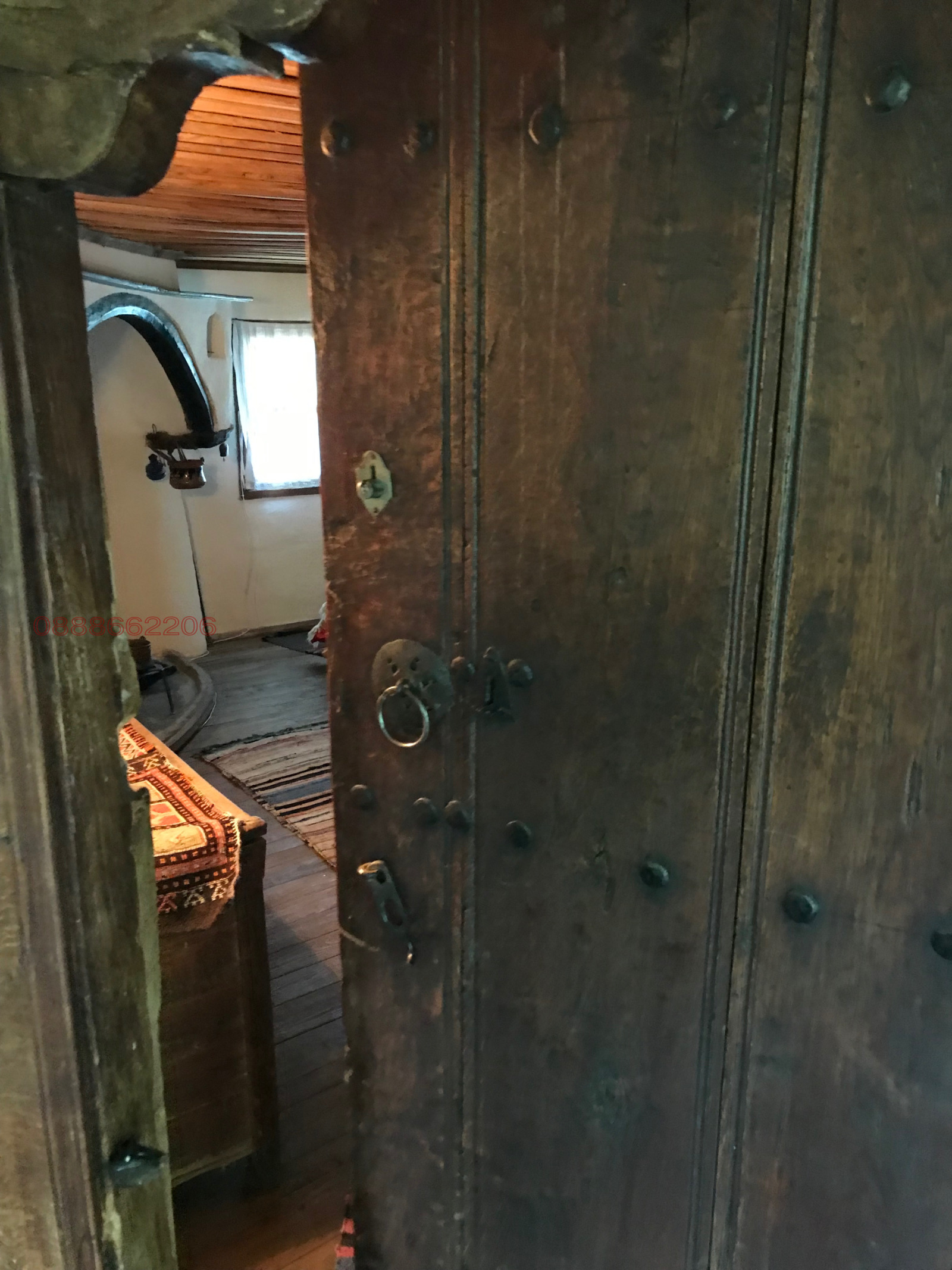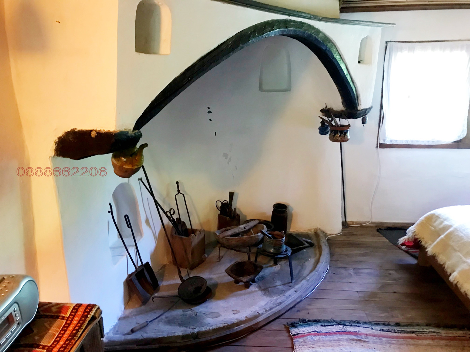На втори етаж имаме голям, остъклен чардак /втора всекидневна/ със сваляема, дървена дограма с гледка към двора и църквата и три спални, две от които с автентични камина и огнище!