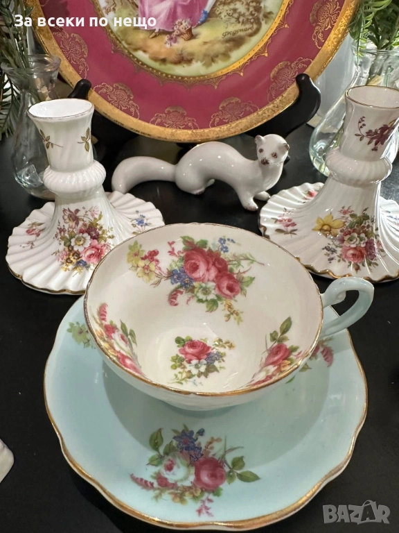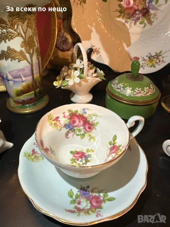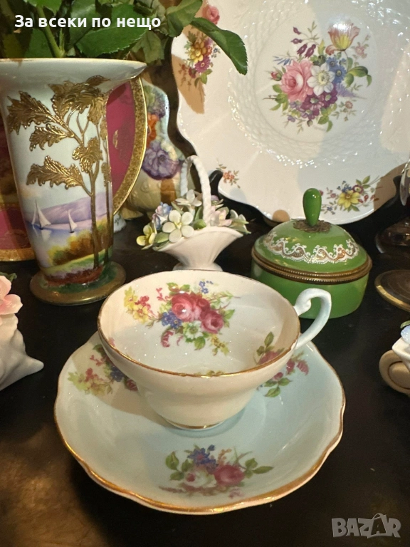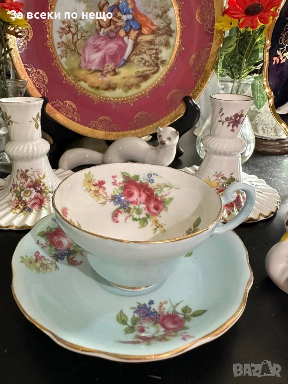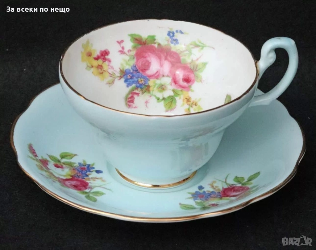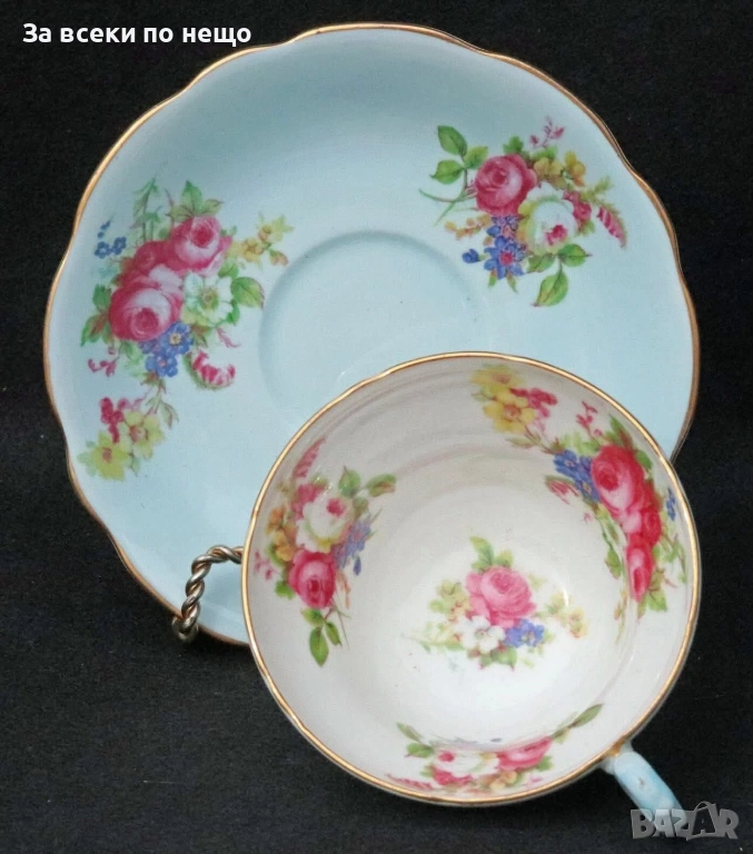 E.B. FOLEY England Circa 1937 - великолепен двоен сет в млечно синьо и много ефектни ръчно изрисувани цветя и букети, невероятна красота и хармония, лек златен кант с много нежност и елегантност, вместимост на чашката 200 мл,отлично качество, невероятна визия, елегантност и сравнително рядка серия.